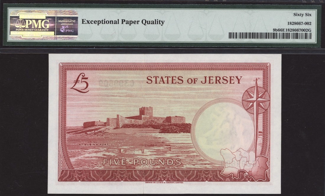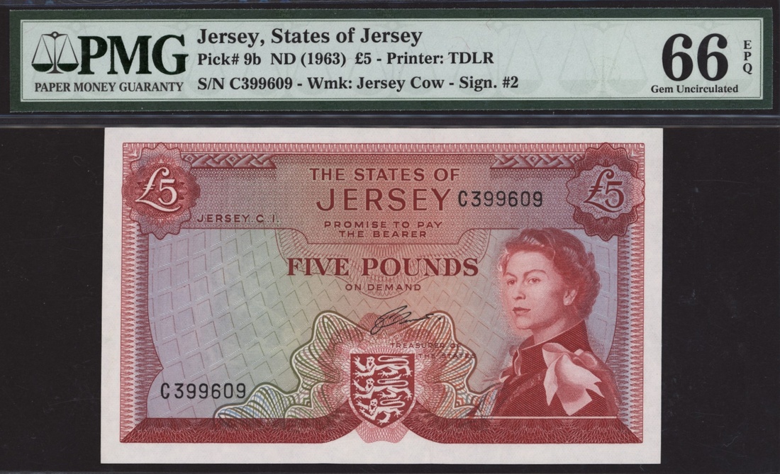 (x) States of Jersey, £5, ND (1963), serial number C399609, (Pick 9b, BNB 109b), in PMG holder 66 EPQ Gem Uncirculated