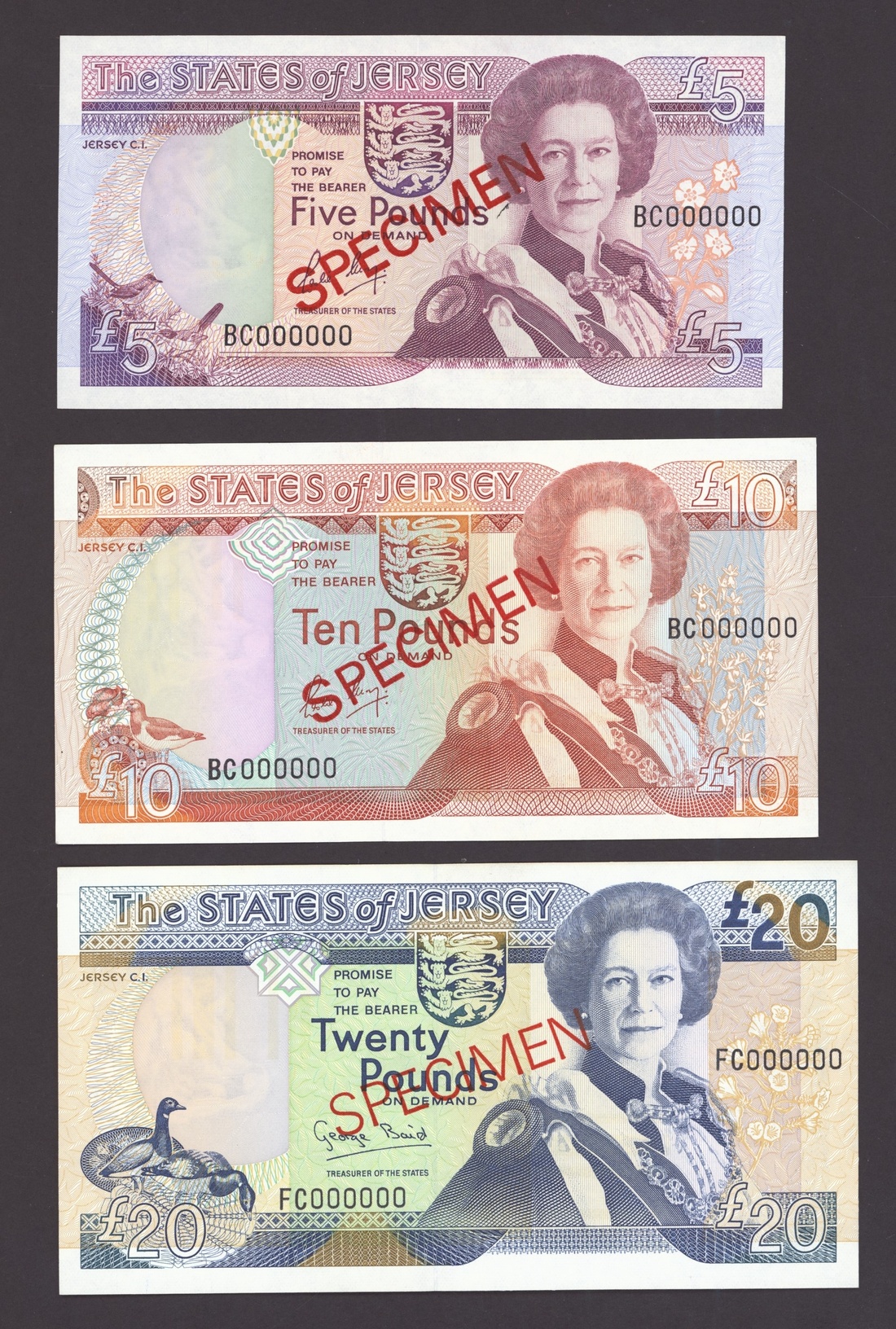 States of Jersey, [3 notes] specimen £5, £10, £20, 1989-93, £5, £10, ND (1989(, serial numbers BC000000; £20, ND (1993), serial number FC000000