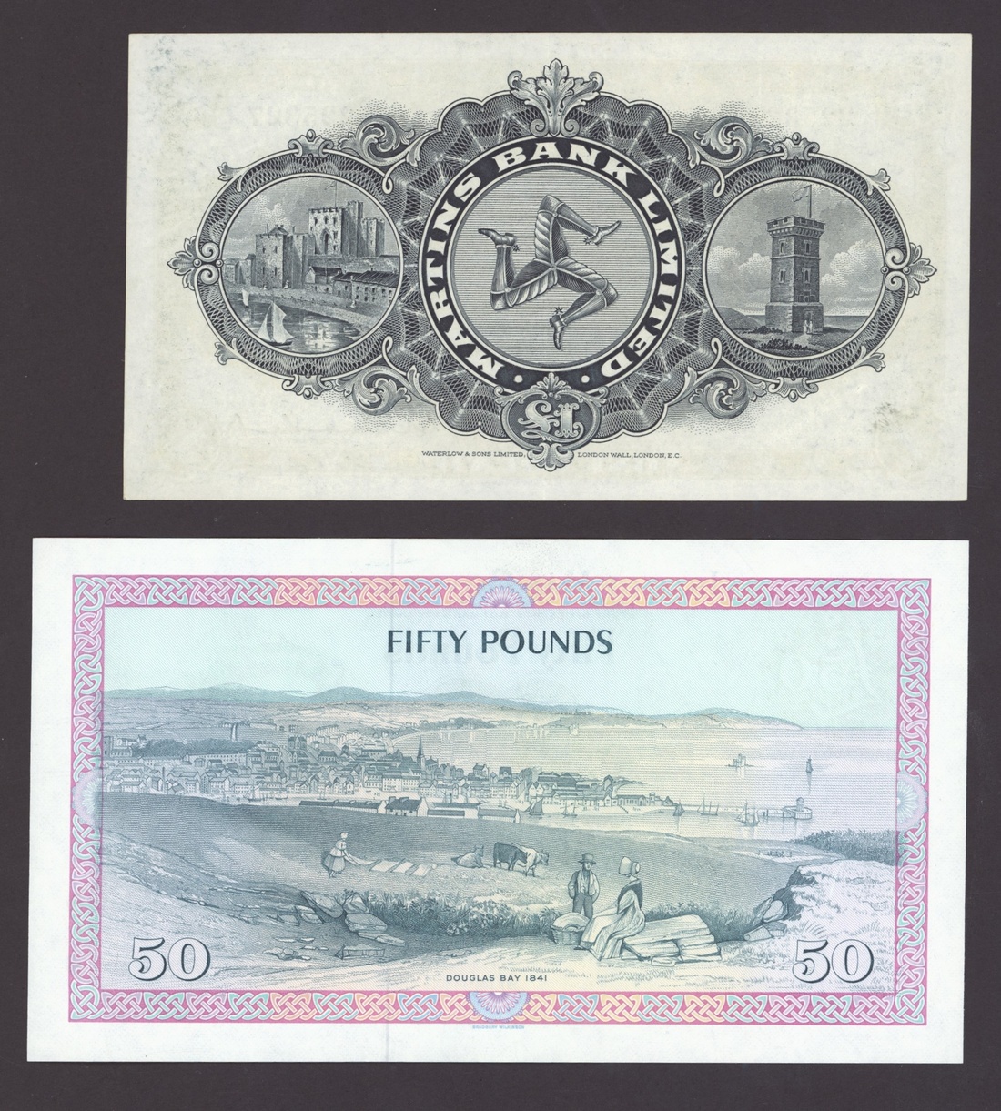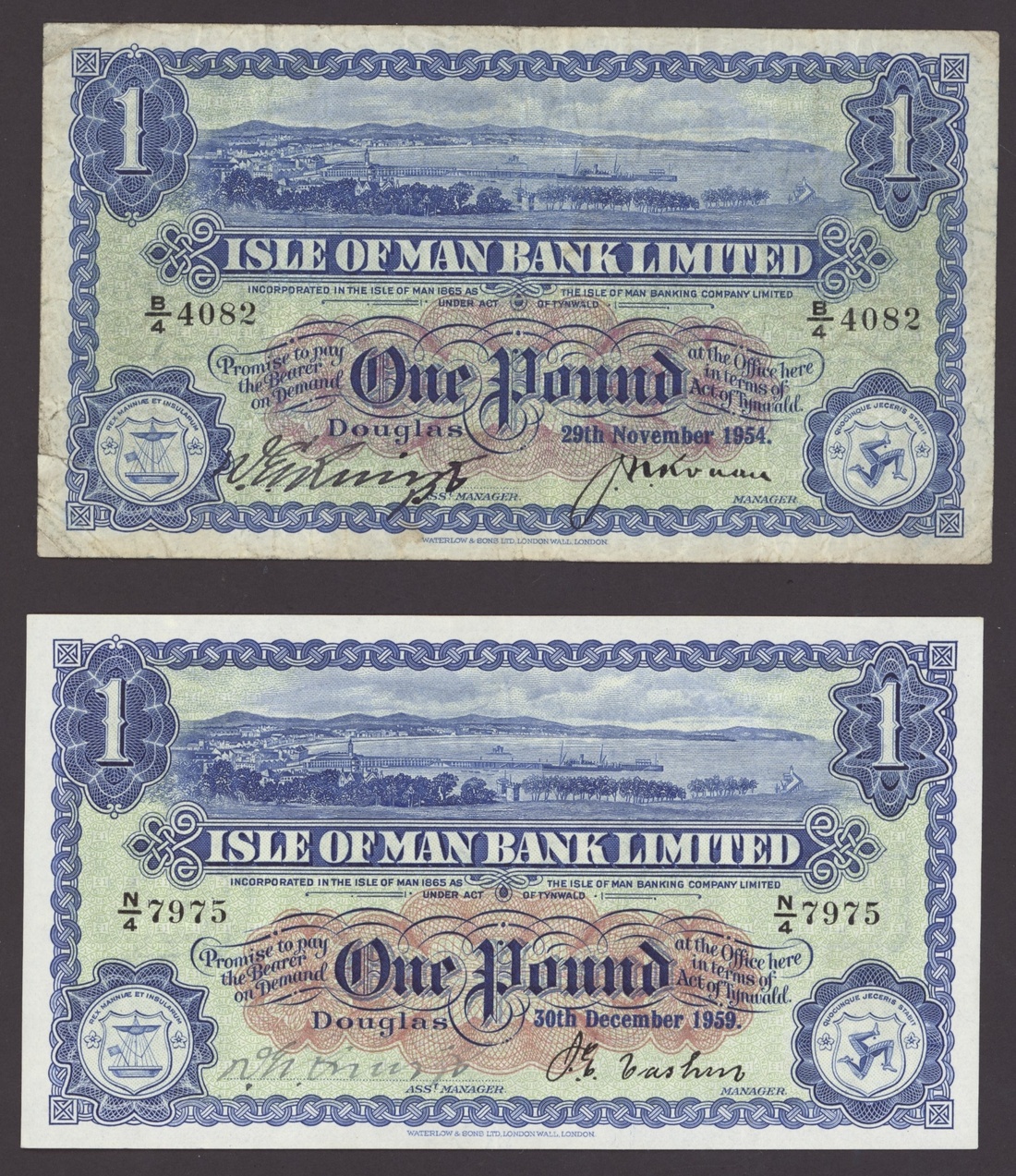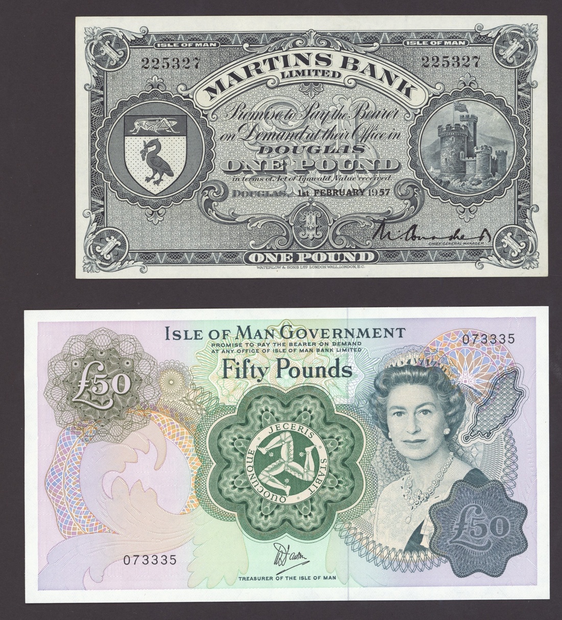 Isle of Man, [4 notes] £1, £50, 1954-1983, Isle of Man Bank Ltd., £1 (2), 29th November 1954, serial number B/4 4082 and 30th December 1959, serial number N/4 7975; Martin's Bank Ltd., £1, Douglas, 1st February 1957, serial number 225327; Isle of Man Government, £50, ND (1983), serial number 073335