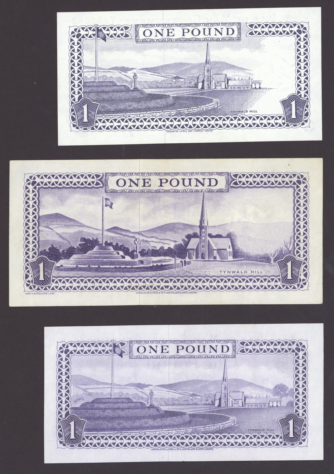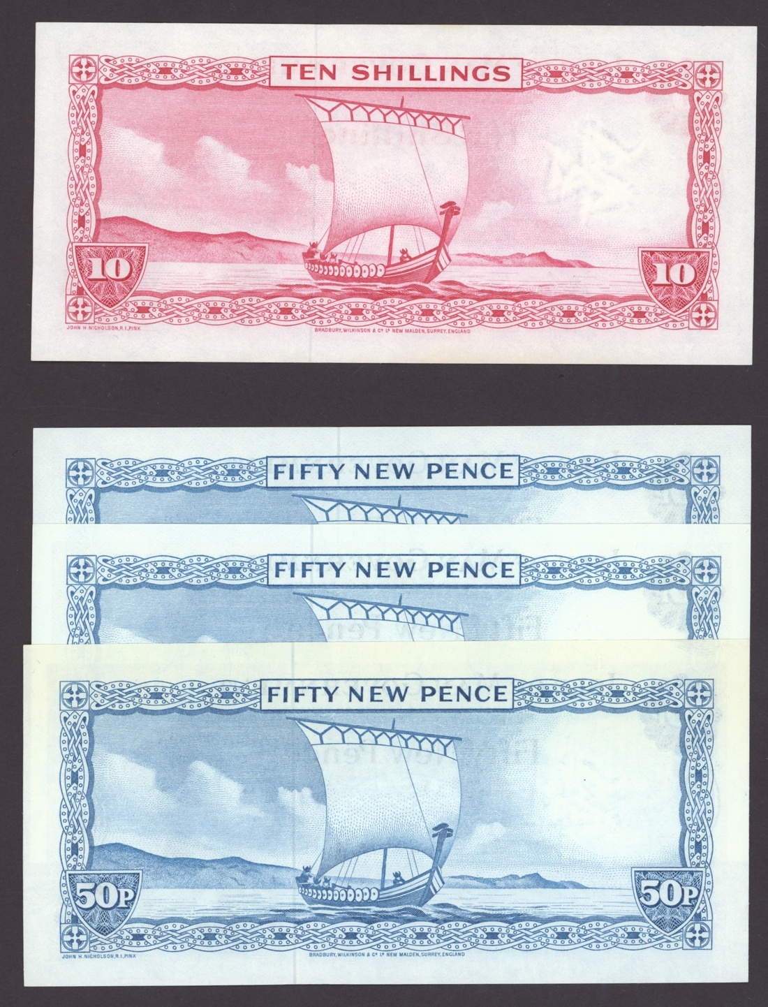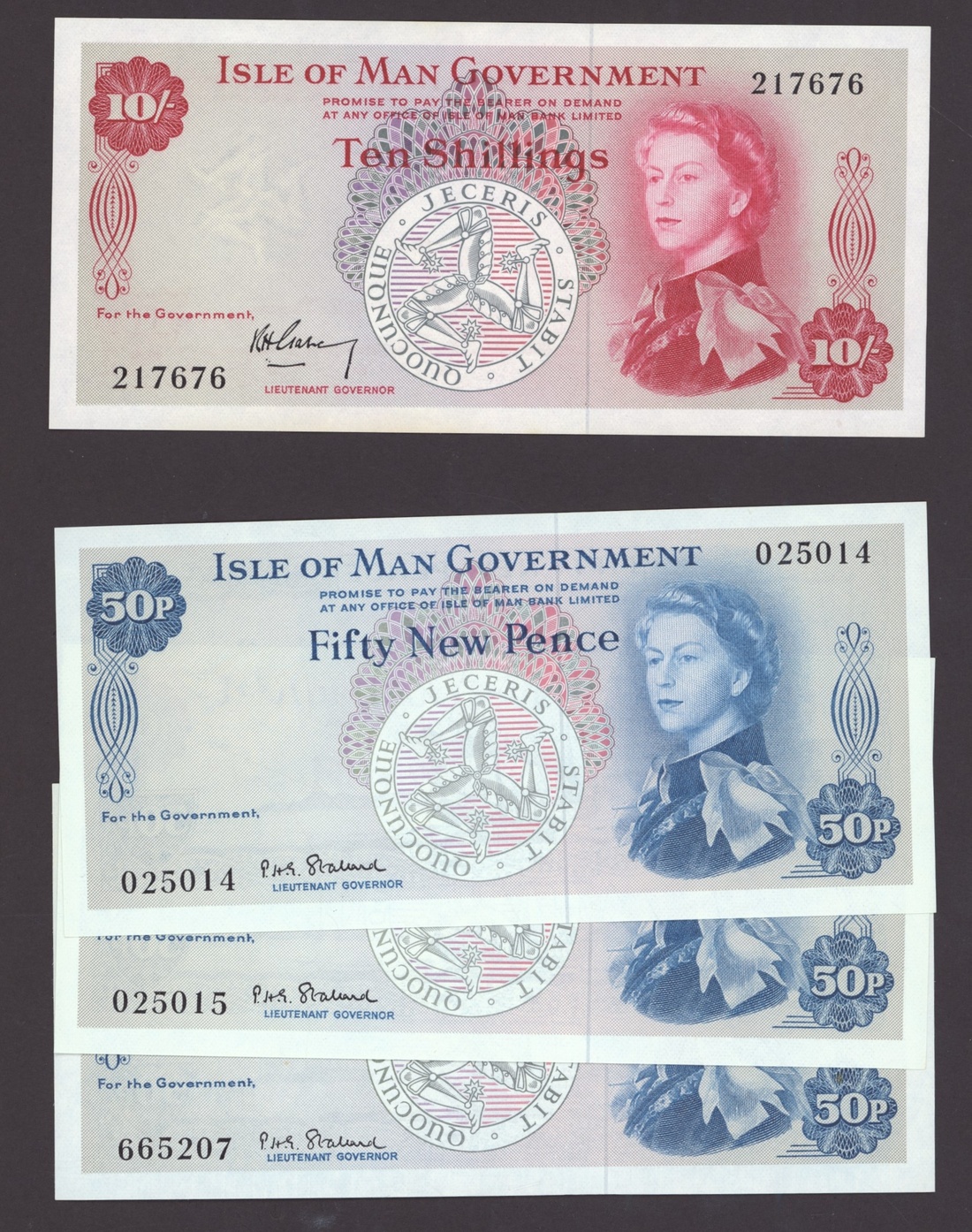 Isle of Man Government, [7 notes] 10 Shillings, 50 Pence, £1, 1961-90, 10/-, ND (1961), serial number 217676; £1, ND (1961), serial number A453091; 50 Pence (3), ND (1969), serial numbers 025014-5 and 665207; £1 (2), ND (1972), serial number D334006, and ND (1990), serial number Y601863