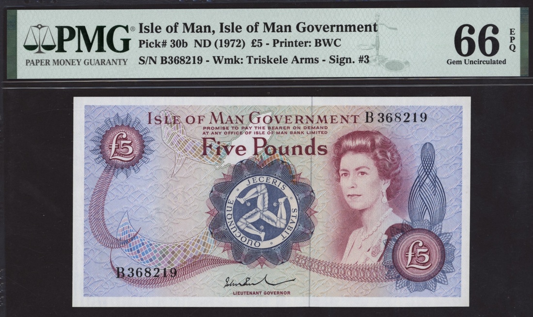 (x) Isle of Man Government, £5, ND (1972), serial number B368219, (Pick 30b), in PMG holder 66 EPQ Gem Uncirculated