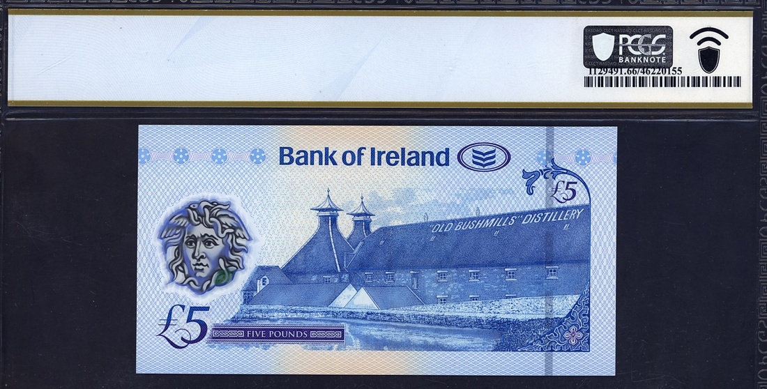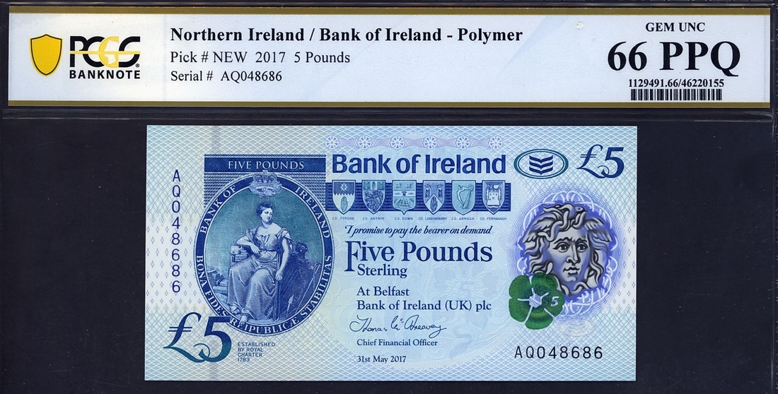 (x) Bank of Ireland, Northern Ireland, £5, 31st May 2017, serial number AQ048686, (BNB 136), in PCGS holder 66 PPQ Gem Uncirculated