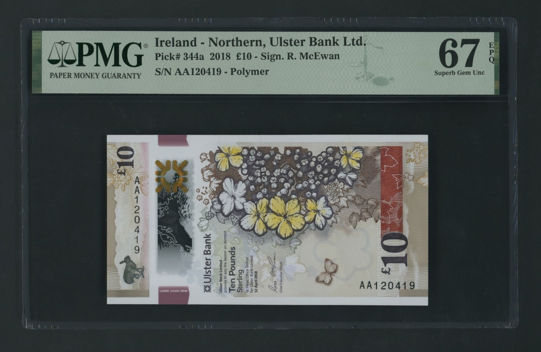 (x) Ulster Bank Ltd., Northern Ireland, polymer £10, 12th April 2018, serial number AA120419, (Pick 344a, BNB 940), in PMG holder 67 EPQ Superb Gem Uncirculated