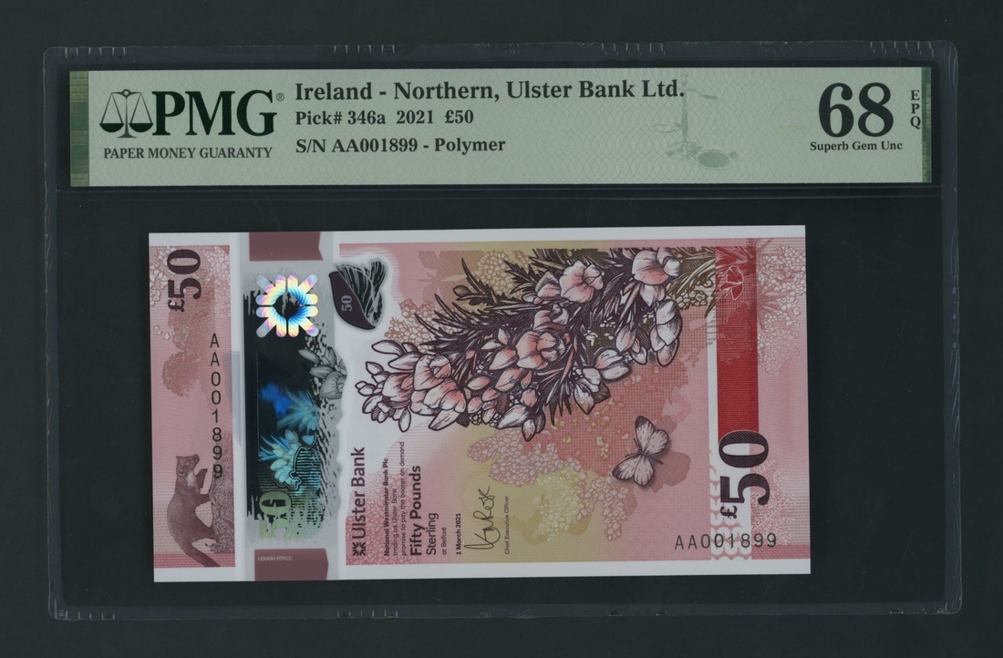 (x) Ulster Bank Ltd., Northern Ireland, polymer £50, 1st March 2021, serial number AA001899, (Pick 346a, BNB 942), in PMG holder 68 EPQ Superb Gem Uncirculated