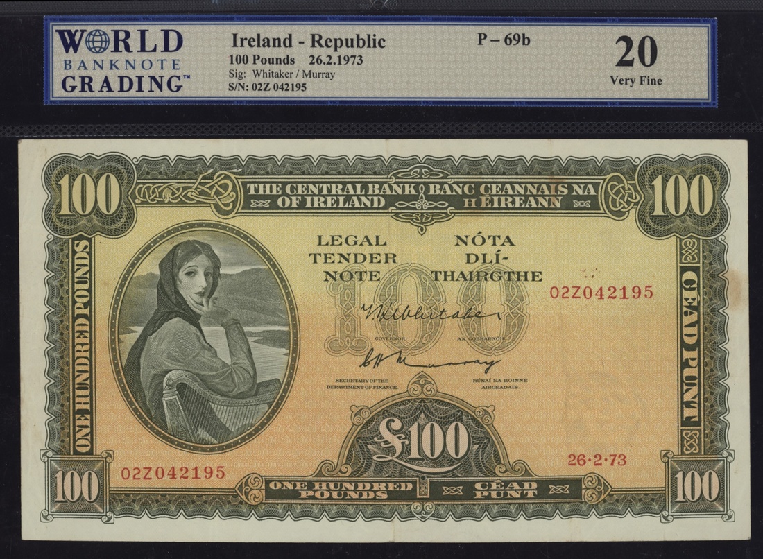 (x) Republic of Ireland, £100, 26th February 1973, serial number 02Z042195, (Pick 69b, BNB 214b), in WBG holder 20 Very Fine