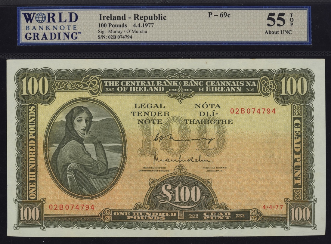 (x) Republic of Ireland, £100, 4th April 1977, serial number 02B074794, (Pick 69c, BNB 214), in WBG holder 55 TOP About Uncirculated