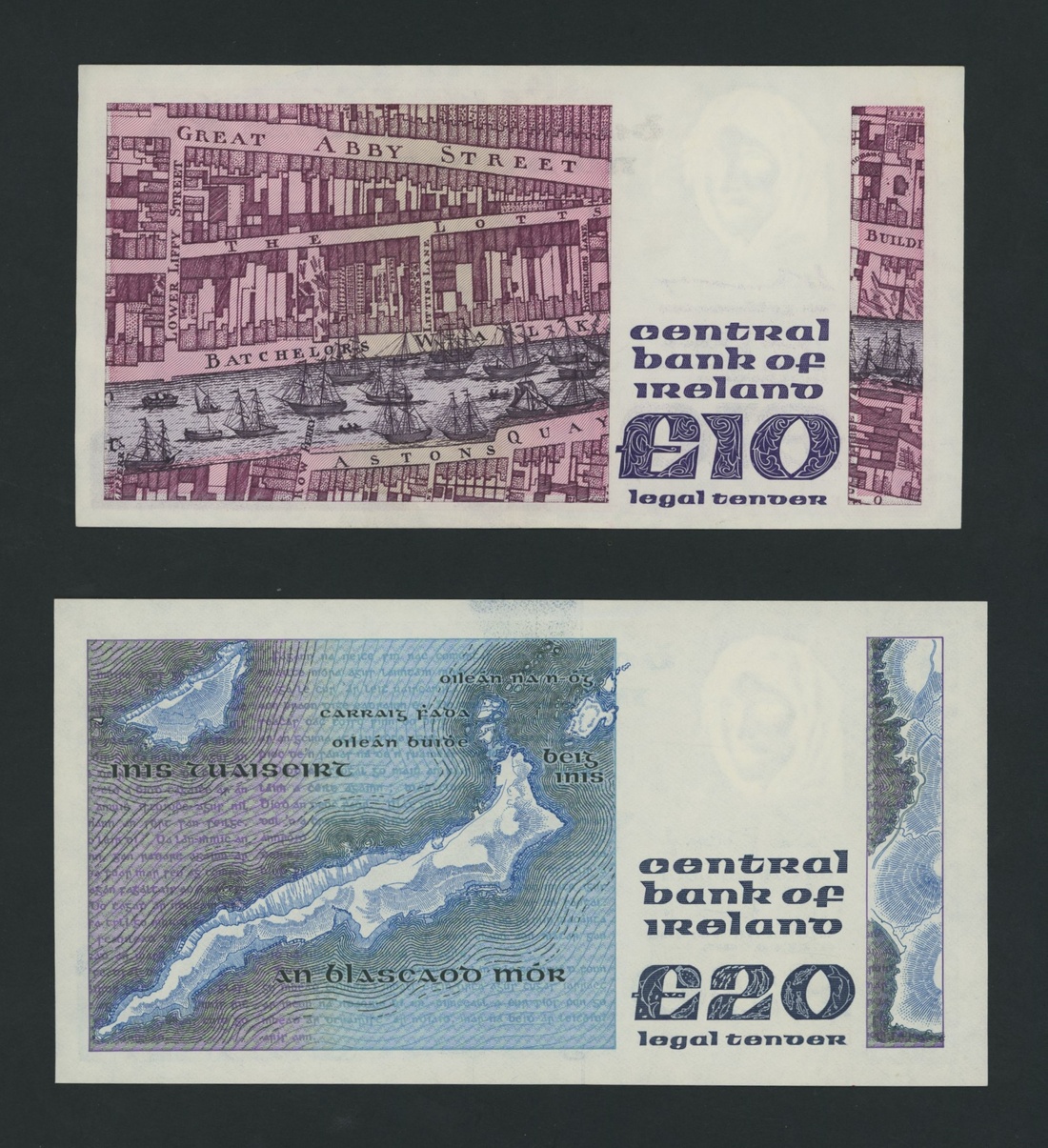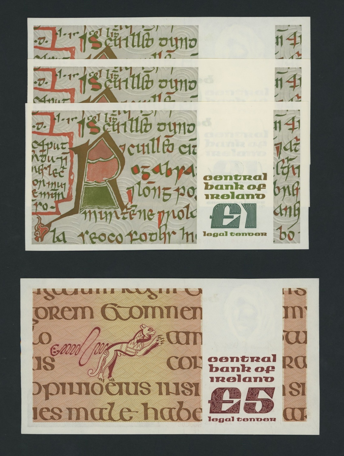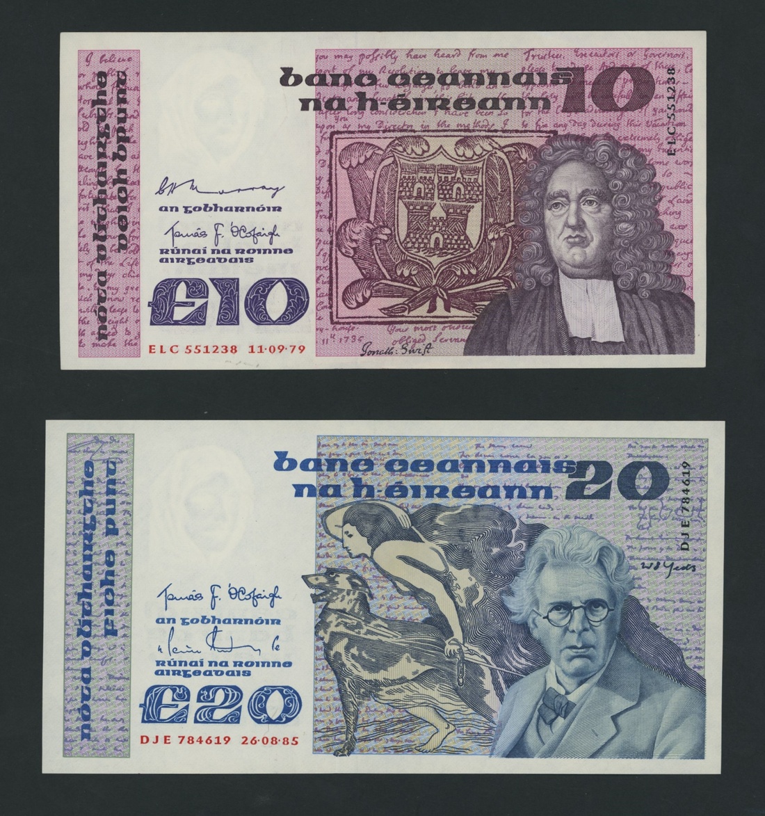 Central Bank, Republic of Ireland, [6 notes] £1, £5, £10, £20, 1979-89, £1, 17th July 1989 (3), consecutive serial numbers AAK 399508-10; £5, 18th October 1985, serial number HGK 709097; £10, 11th September 1979, serial number ELC 551238; £20, 26th August 1985, serial number DJE 784619