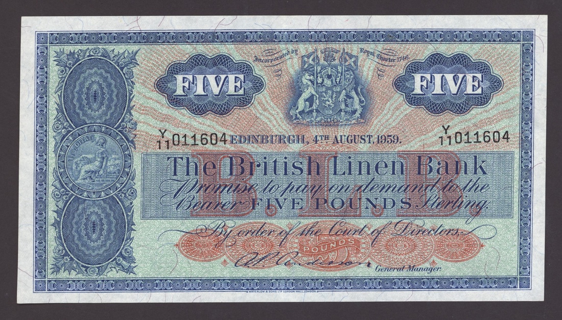 British Linen Bank, Scotland, £5, Edinburgh, 4th August 1959, serial number Y/11 011604, (PMS BL 67e), about uncirculated