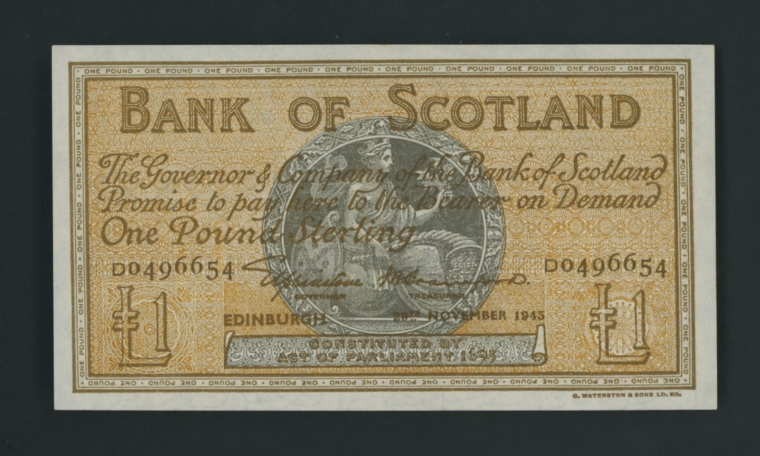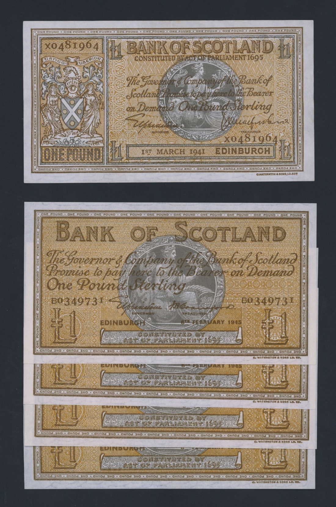 Bank of Scotland, [6 notes] £1, Edinburgh, 1941-5, 1st March 1941, serial number X0481964; 6th February 1945 (4), serial numbers: B0349713, 349741, 349743, 349744; 29th November 1945, serial number D0496654