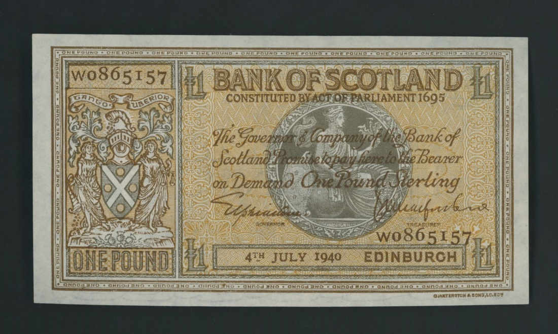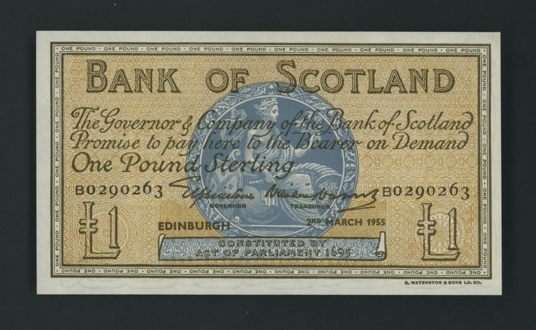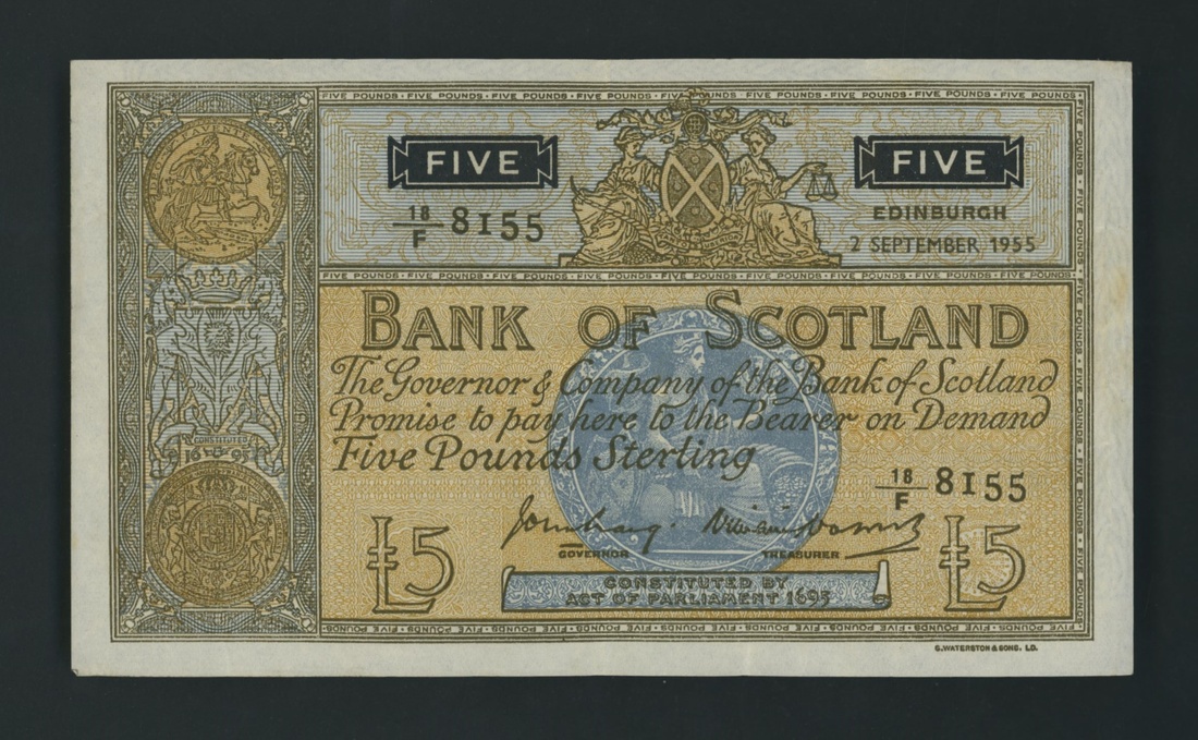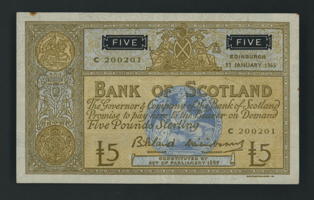 Bank of Scotland, [4 notes] £1, £5, Edinburgh, 1940-65, £1, 4th July 1940, serial number W0865157; £1, 2nd March 1955, serial number B0290263; £5, 2nd September 1955, serial number 18/F 8155; £5, 11th January 1965, serial number C200201