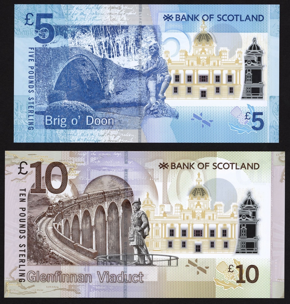 Bank of Scotland, polymer £5, £10, 2016, matching serial numbers AA 002767, (Pick 130, 131), uncirculated (2 notes)
