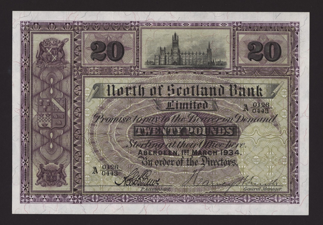 North of Scotland Bank, £20, Aberdeen, 1st March 1934, serial number A 0126/0443, (NS 41), uncirculated, rare especially in such a grade