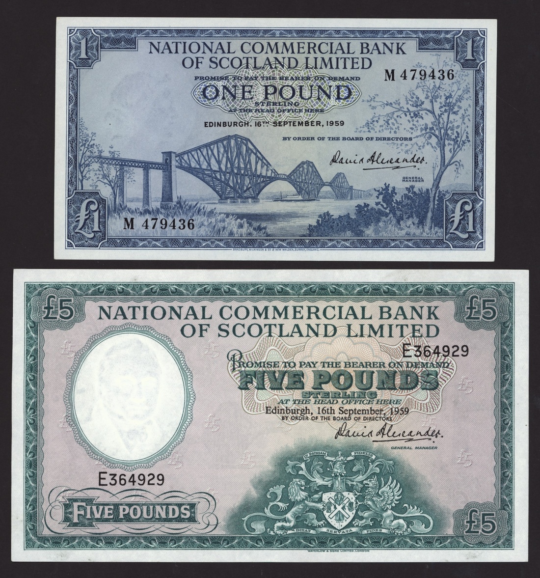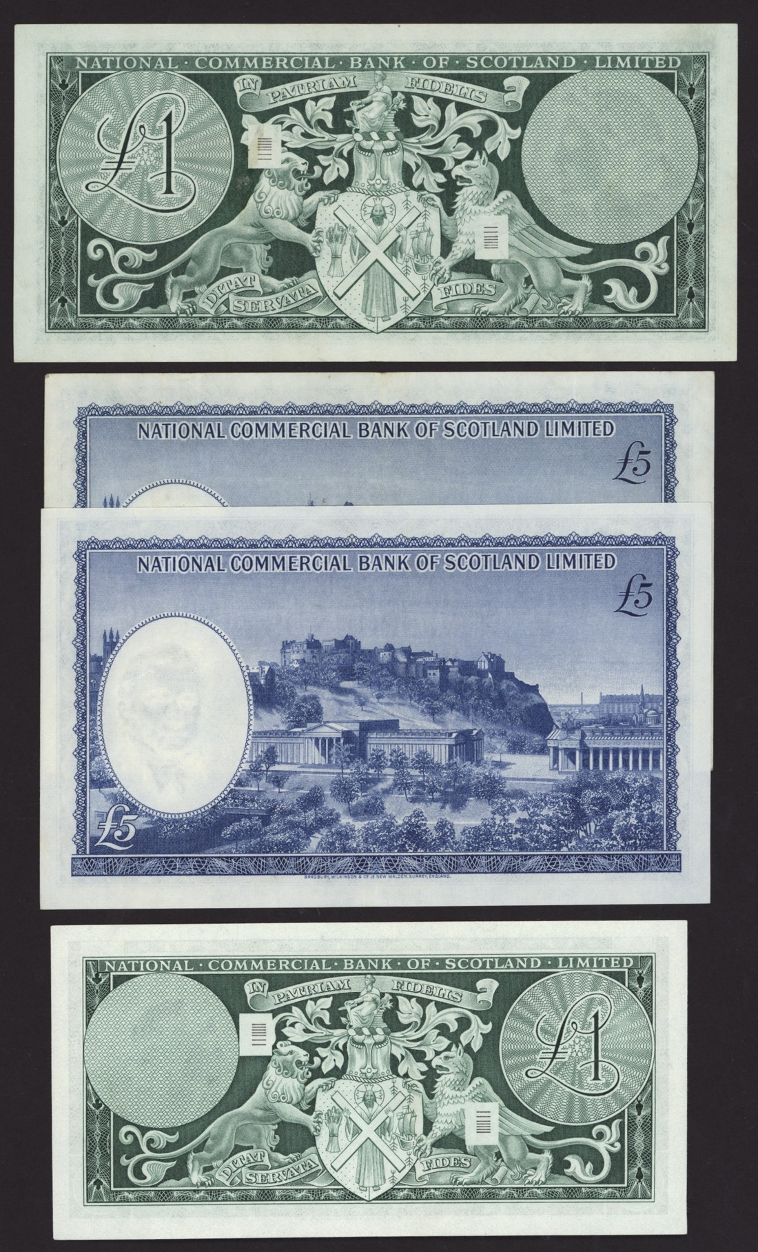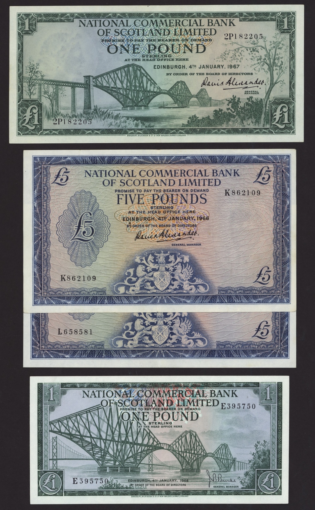 National Commercial Bank of Scotland, [7 notes] £1, £5, £20, Edinburgh, £1, 16th September 1959, M479436; £5, 16th September 1959, serial number E364929; £1, 4th January 1967, serial number 2P182205; £5 (2): 4th January 1966, serial number K862109, 1st August 1966, serial number L658581; 4th January 1968, serial number E395750
