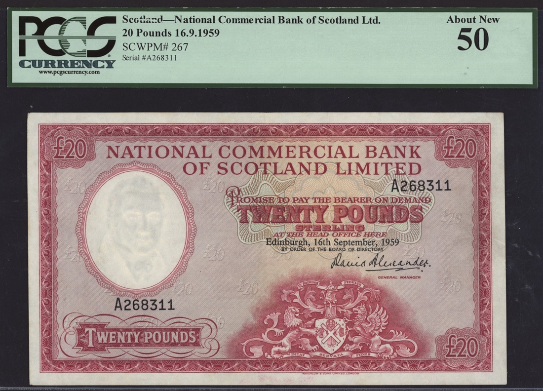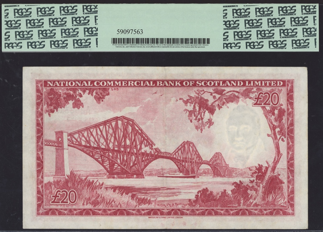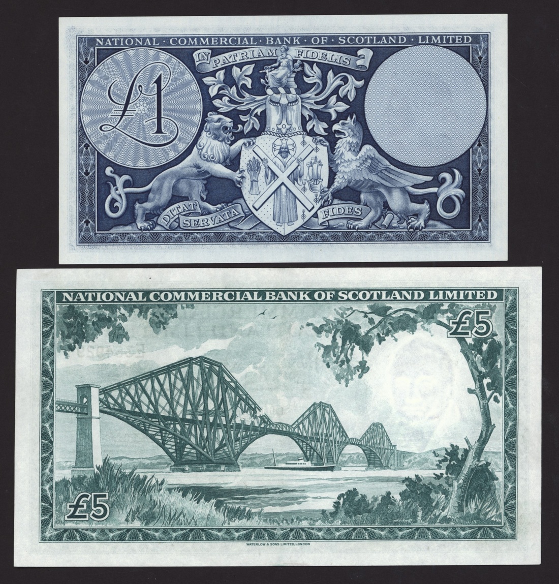 National Commercial Bank of Scotland, [7 notes] £1, £5, £20, Edinburgh, £1, 16th September 1959, M479436; £5, 16th September 1959, serial number E364929; £1, 4th January 1967, serial number 2P182205; £5 (2): 4th January 1966, serial number K862109, 1st August 1966, serial number L658581; 4th January 1968, serial number E395750