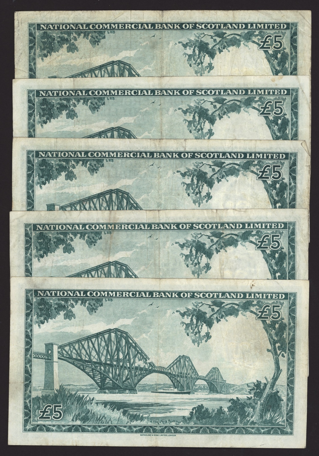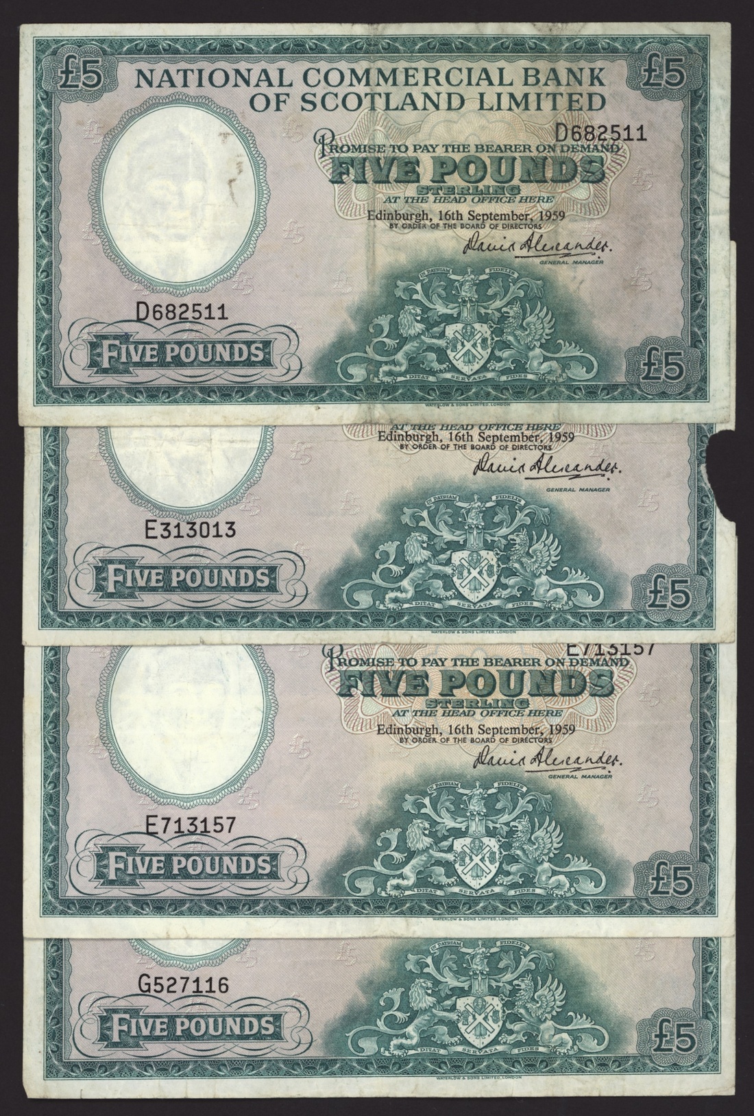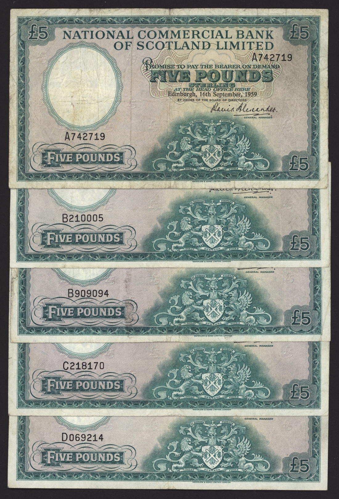 National Commercial Bank of Scotland, [9 notes] £5, Edinburgh, 16th September 1959, serial numbers A742719, B210005, B909094, C218170, D069214, D682511, E313013, E713157, and G527116