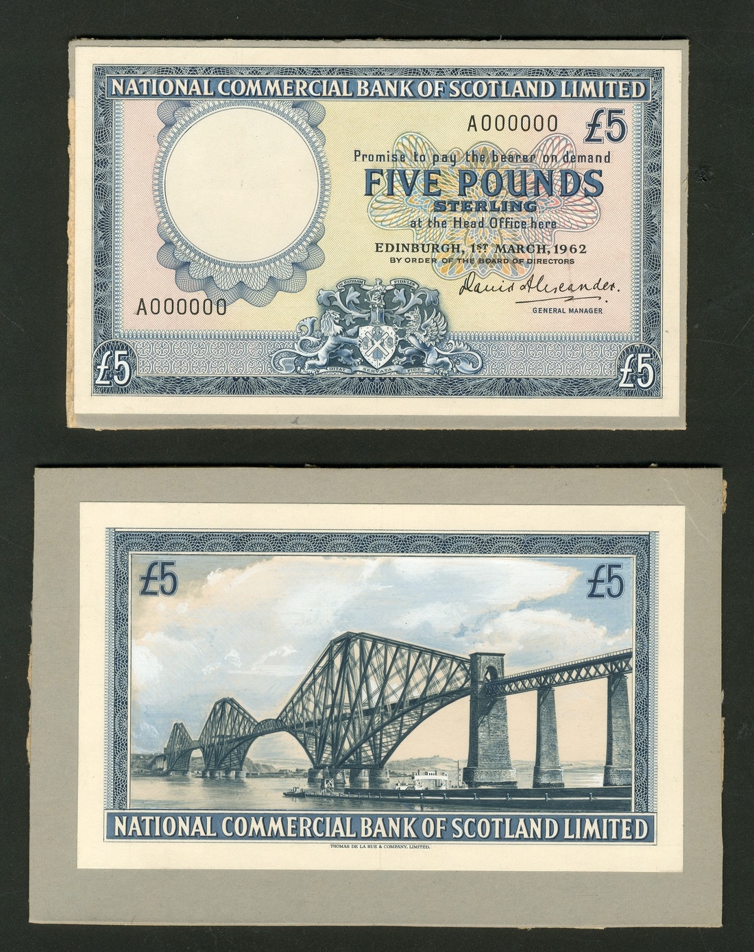 National Commercial Bank of Scotland, a printer's archival composite obverse and reverse essay on board for a proposed issue of £5, 1 March 1962, serial number A000000, blue and multicoloured, arms low centre, value in three corners and at in text at top centre right, signature of David Alexander low right, reverse blue, the Forth Railway Bridge, value top left and right