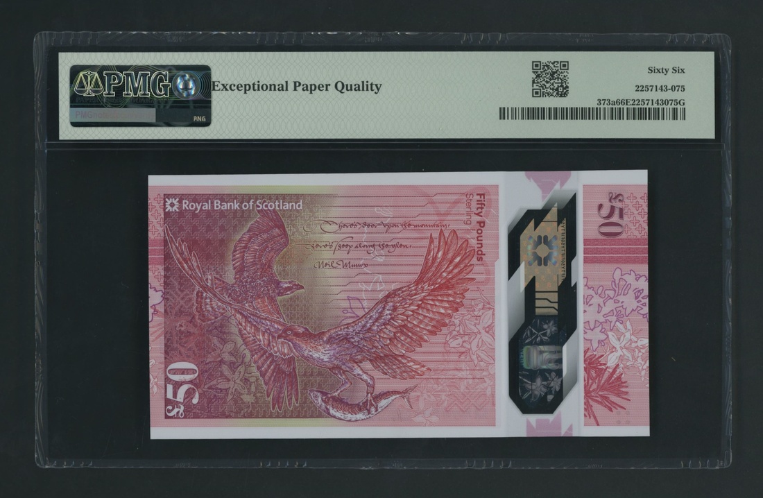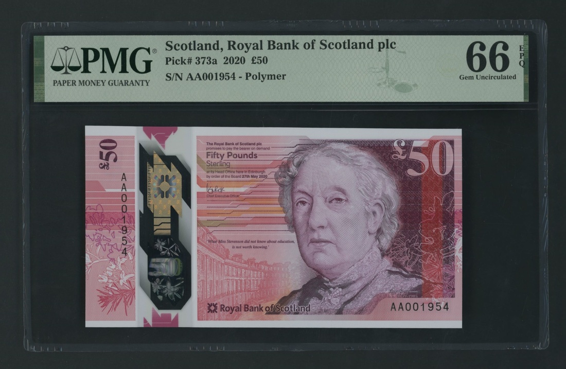 (x) Royal Bank of Scotland, polymer £50, 27th May 2020, serial number AA001954, red, Scottish education pioneer Flora Stevenson at right,