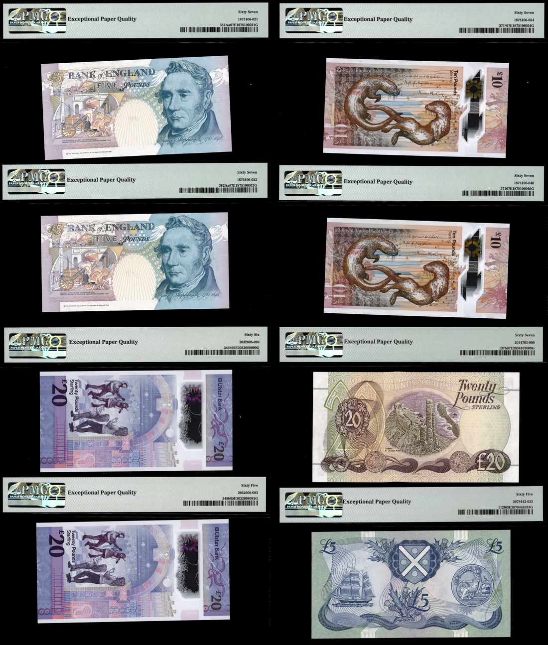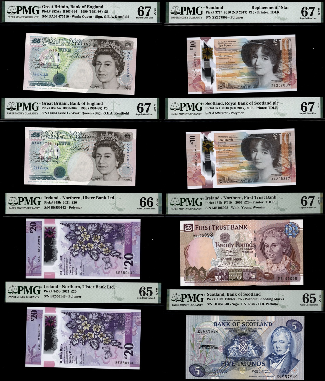 (x) A group of graded British Banknotes, including Bank of England, £5 (2) 1990, Bank of Scotland £5, £10 and replacement £10, 2017, First Trust Bank £20 2007, Ulster Bank £20 (2) 2021,