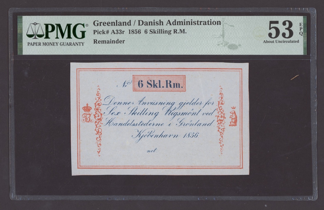 Greenland, Danish Administration, 6 Skilling Rigsmont, 1856, (Pick A33r), in PMG holder 53 EPQ About Uncirculated, scarce