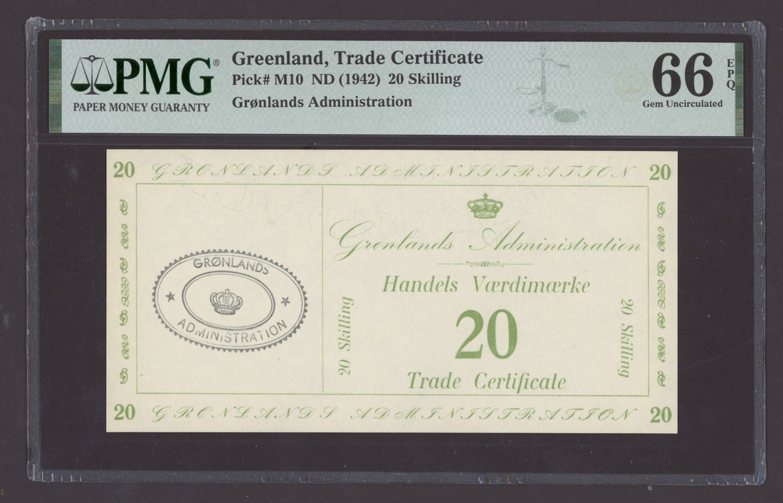 Greenland, Danish Administration, 20 Skilling, ND (1942), (Pick M10), in PMG holder 66 EPQ Gem Uncirculated, scarce, especially in such a high grade