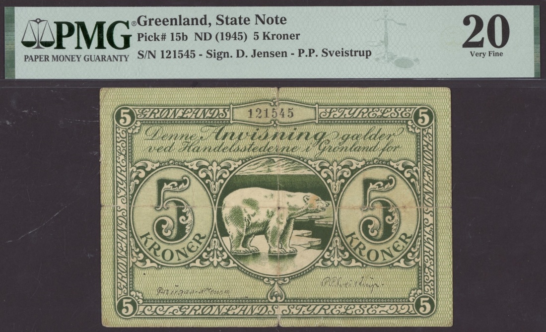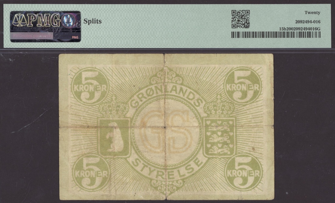 (x) Greenland, State Note, 5 Kroner, ND (1945), serial number 121545, (Pick 15b), in PMG holder 20 Very Fine, splits