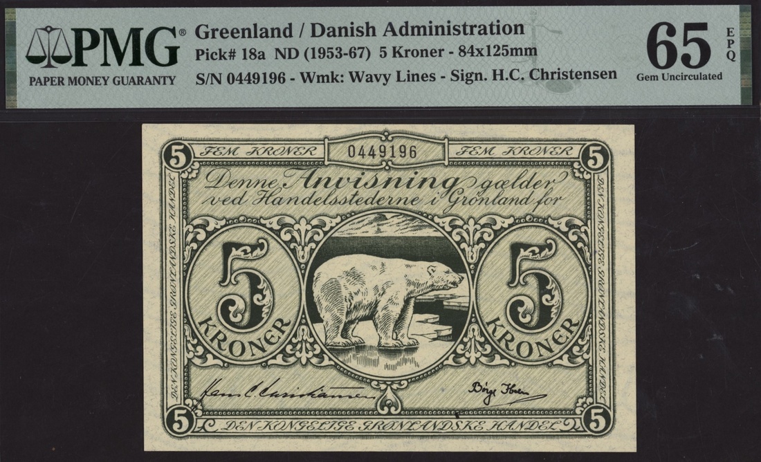 (x) Greenland, Danish Administration, 5 Kroner, ND (1953-1967), serial number 0449196, (Pick 18a), in PMG holder 65 EPQ Gem Uncirculated