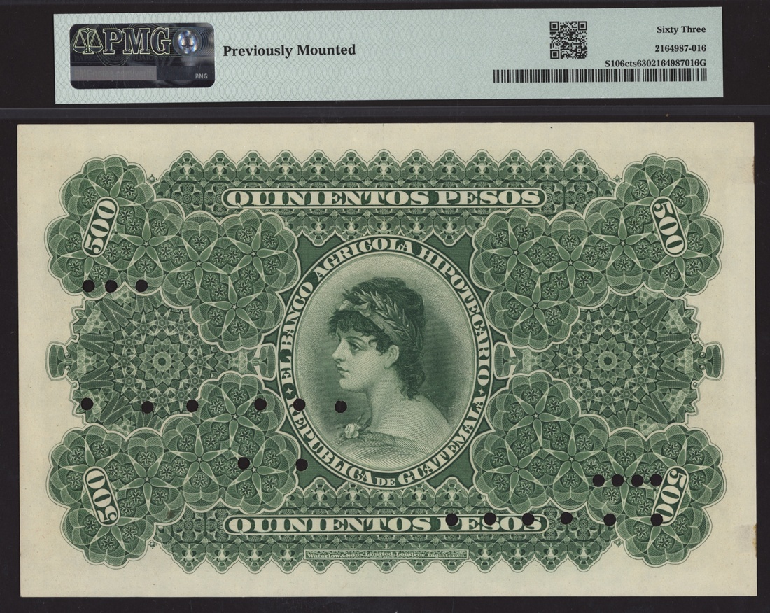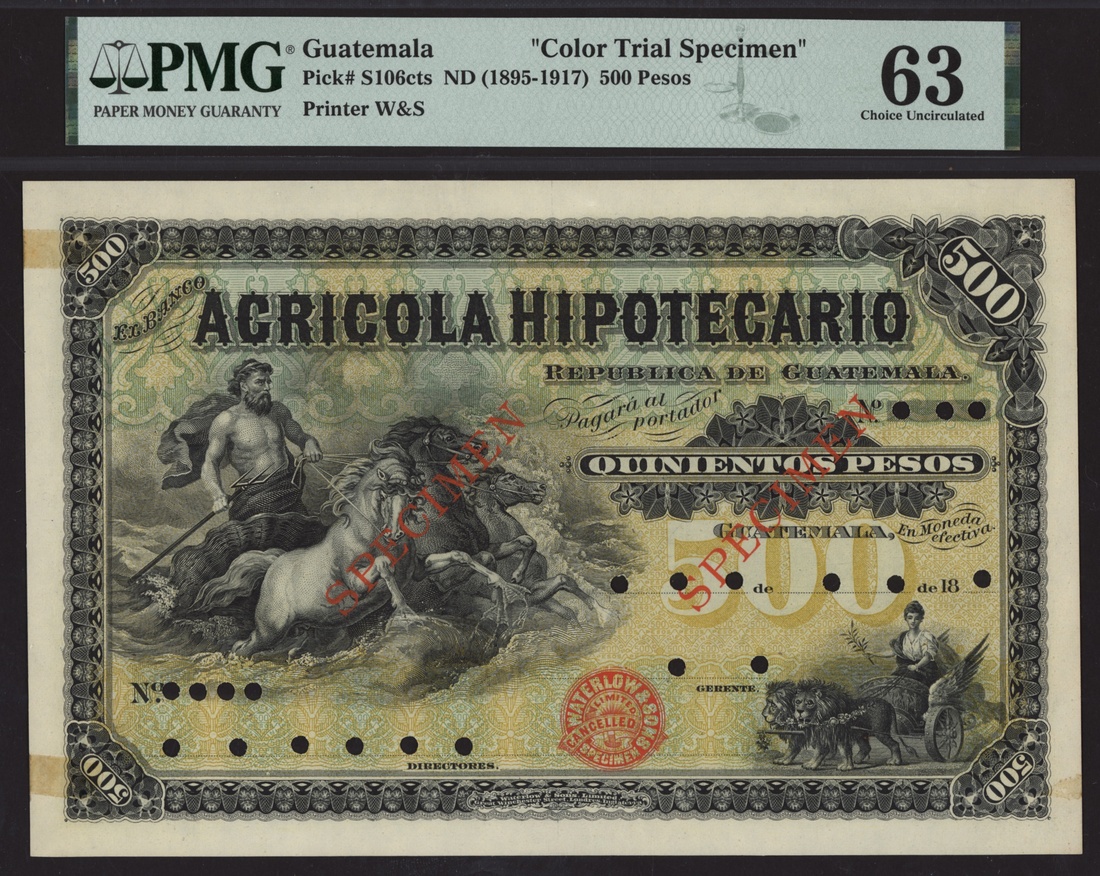 Banco Agricola Hipotecario, Republica de Guatemala, colour trial specimen 500 Pesos, 18--,