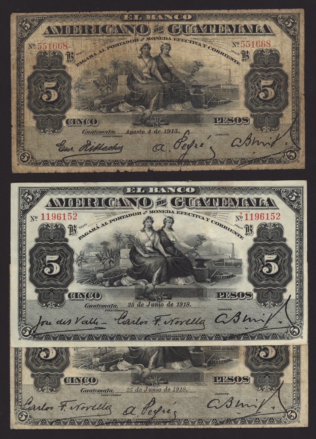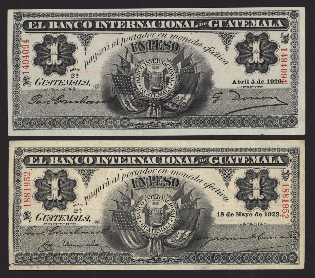 El Banco Americano de Guatemala, El Banco Internacional de Guatemala, [5 notes] 1, 5 Pesos, 1915-1923,