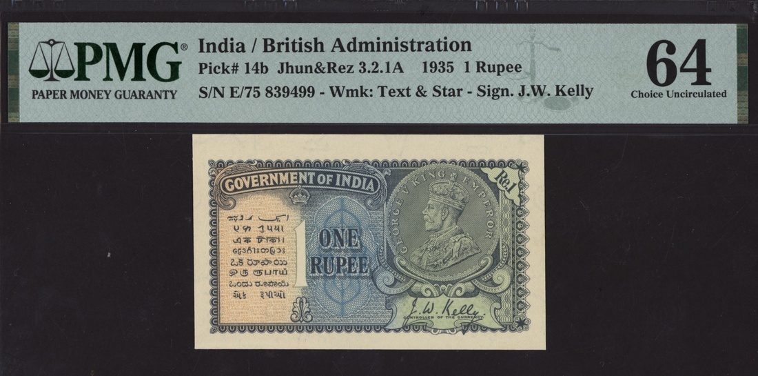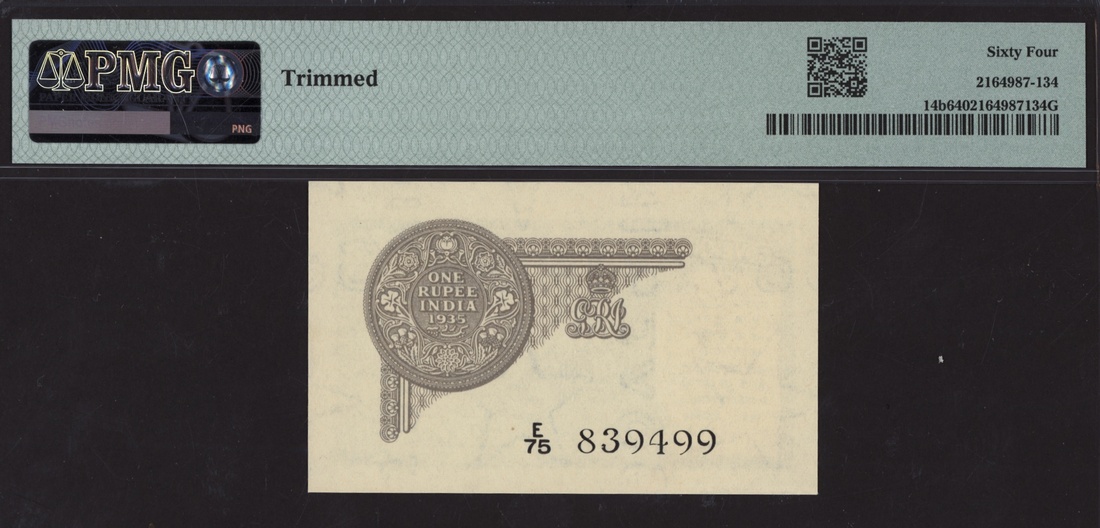 (x) Government of India, 1 Rupee, 1935, serial number E/75 839499, (Pick 14b, Jhun&Rez 3.2.1A, BNB 148), in PMG holder 64 Choice Uncirculated, trimmed
