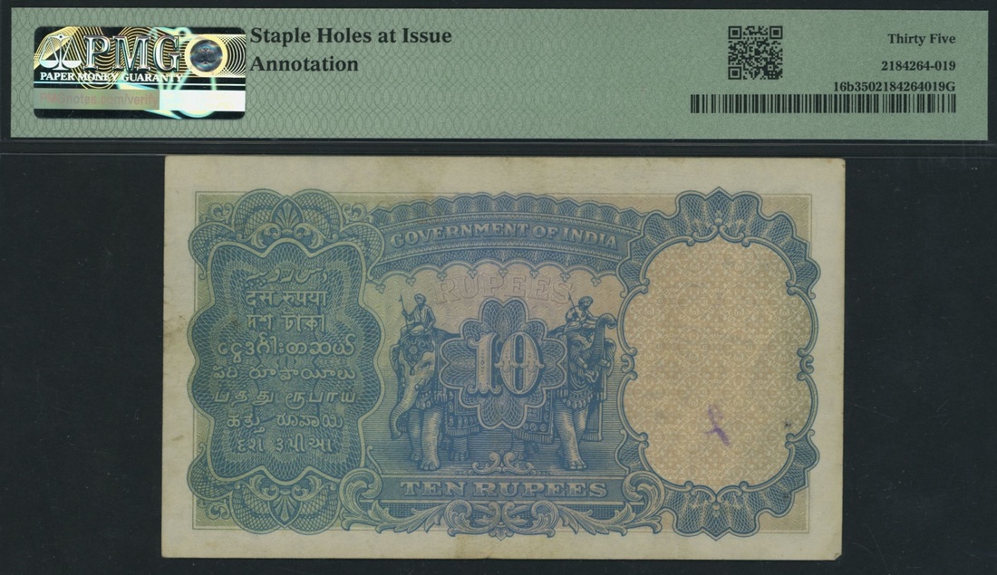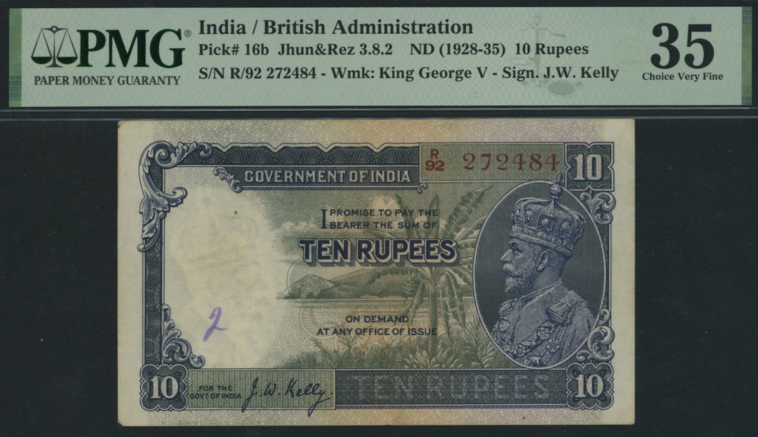 (x) Government of India, British Administration, 10 Rupees, ND (1928-35), serial number R/92 272484, (Pick 16b, Jhun&Rez 3.8.2, BNB 150b), in PMG holder 35 Choice Very Fine, staple holes at issue, annotation