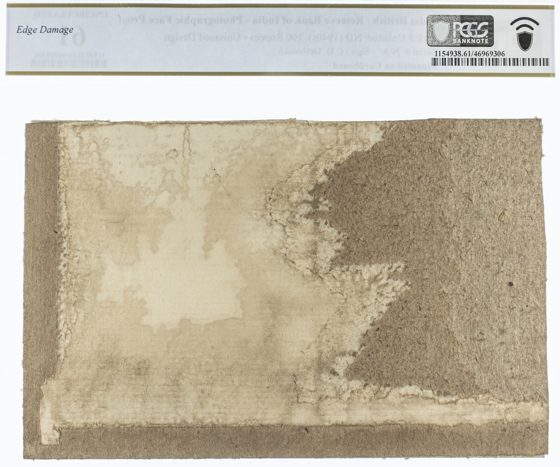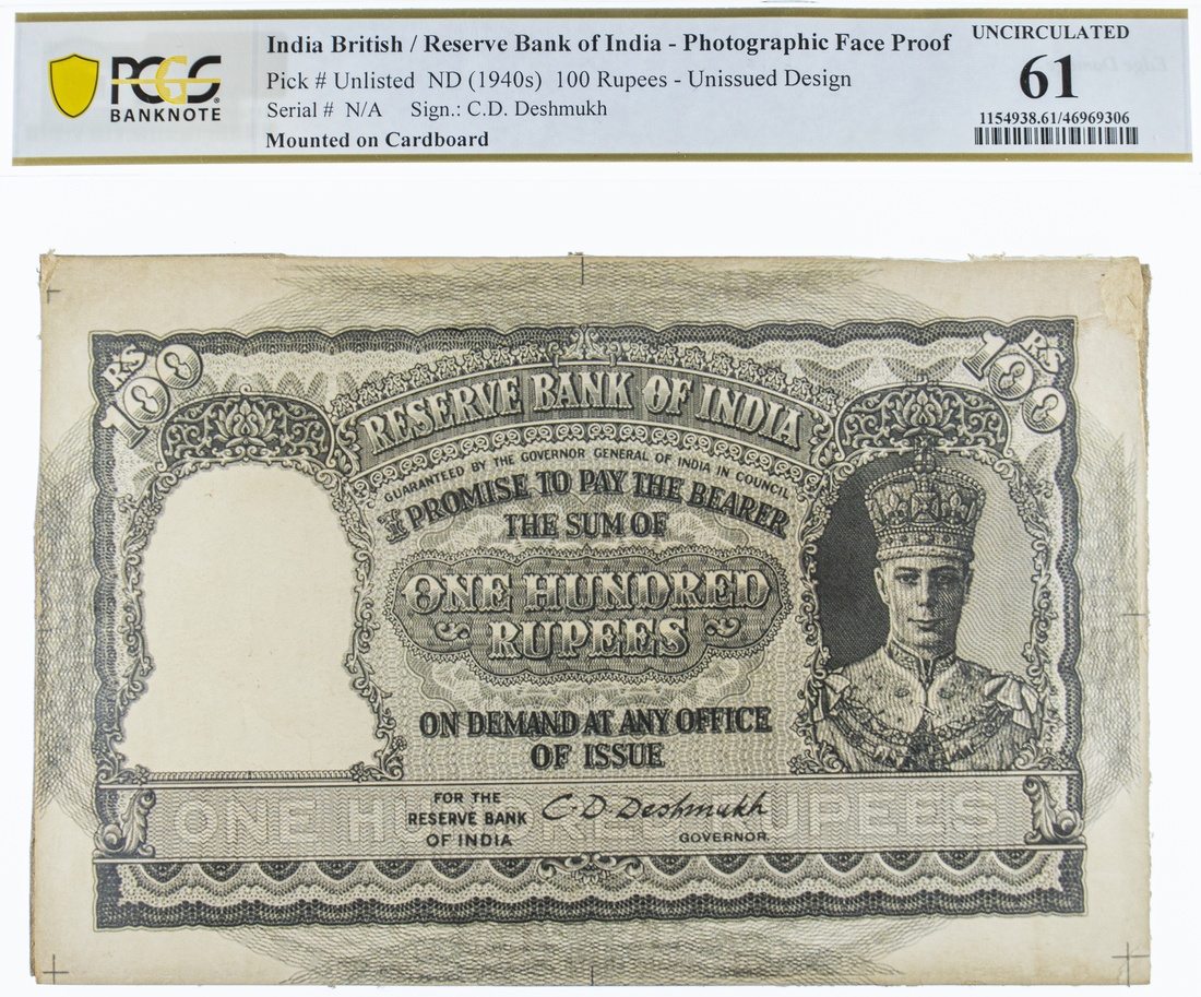 (x) Reserve Bank of India, photographic face proof 100 Rupees, ND (1940s), no serial number, unissued design, mounted on cardboard