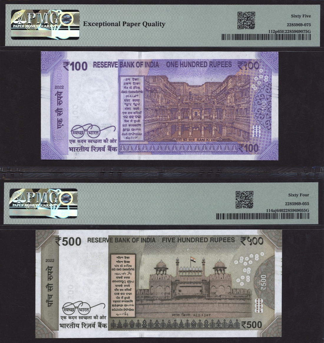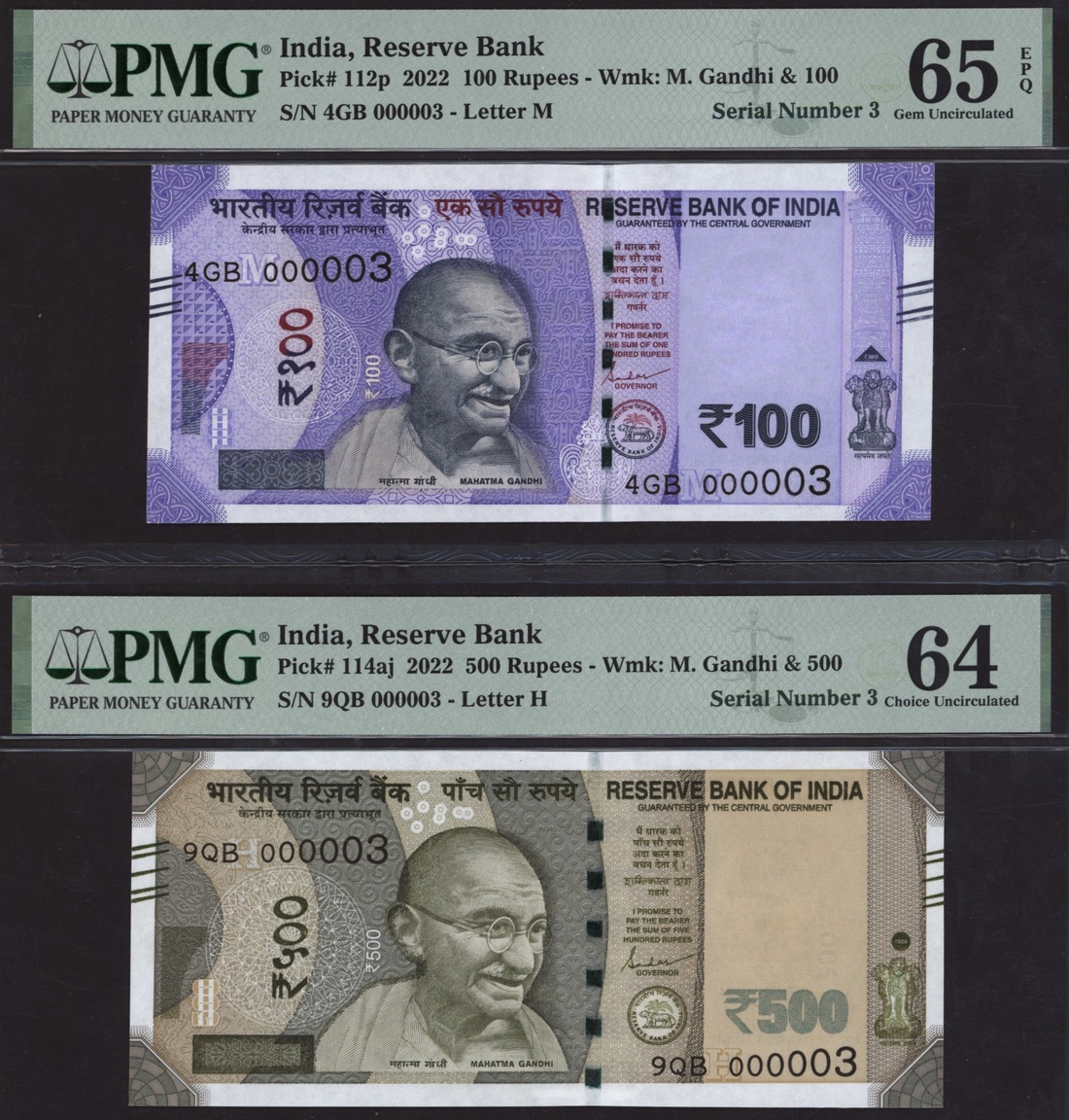 (x) Pair of Reserve Bank of India notes, [2 notes] 100, 500 Rupees, 2022, serial numbers 4GB 000003 and 9QB 000003, (Pick 112p, 114aj), in PMG holders 65 EPQ Gem Uncirculated and 64 Choice Uncirculated (2 notes)