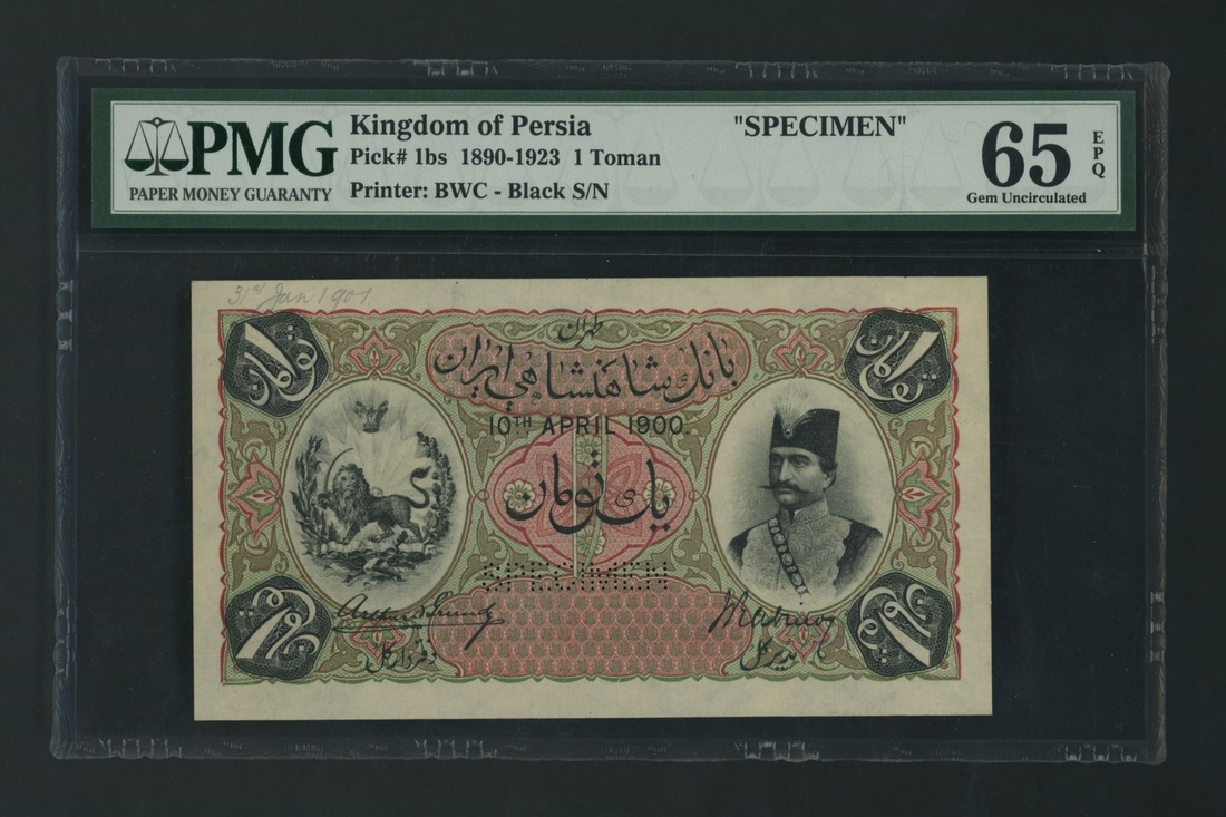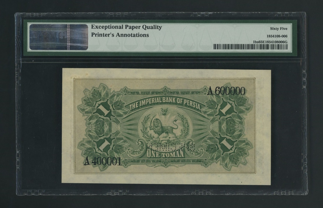 (x) Imperial Bank of Persia, specimen 1 Toman, 10th April 1900, black serial number range A 400001- A 600000, variety of this specimen not listed on the banknote book, horizontal SPECIMEN perforation, dated 10th April 1900, with black serial number range A 400001- A 600000