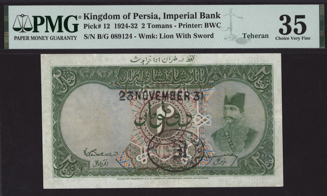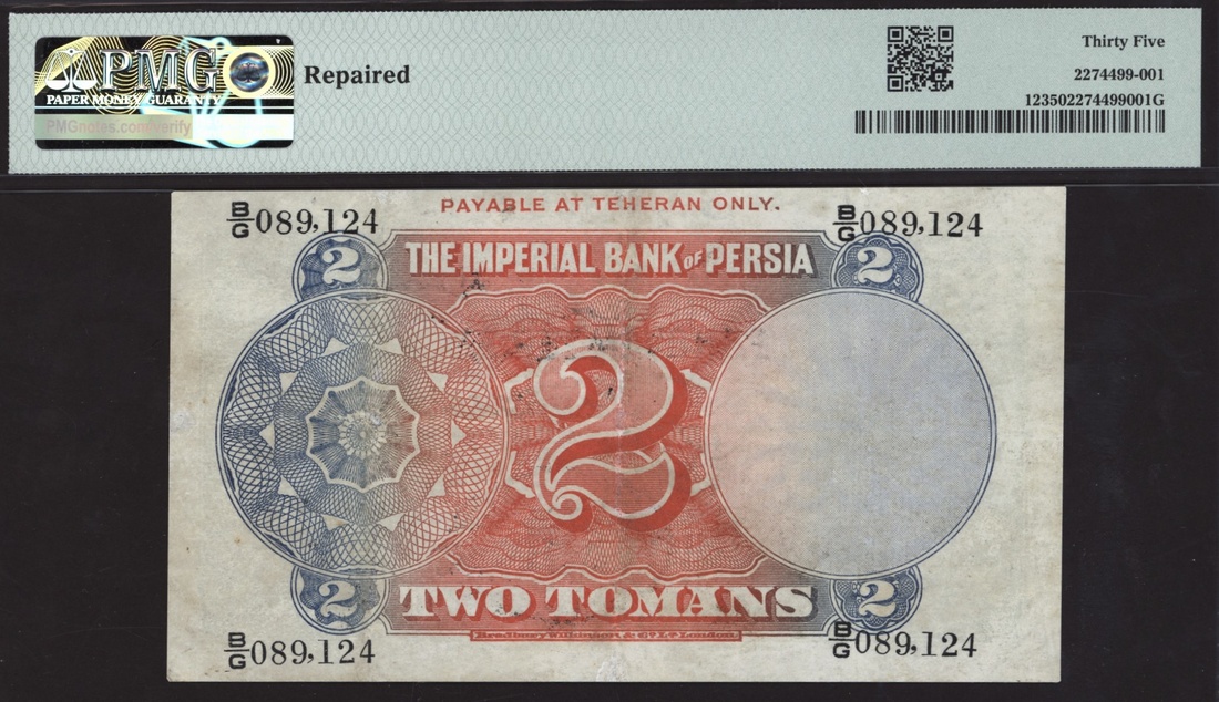 Imperial Bank of Persia, 2 Tomans, 23 November 1931, serial number B/G 089,124, (Pick 12), in PMG holder 35 Choice Very Fine, repaired
