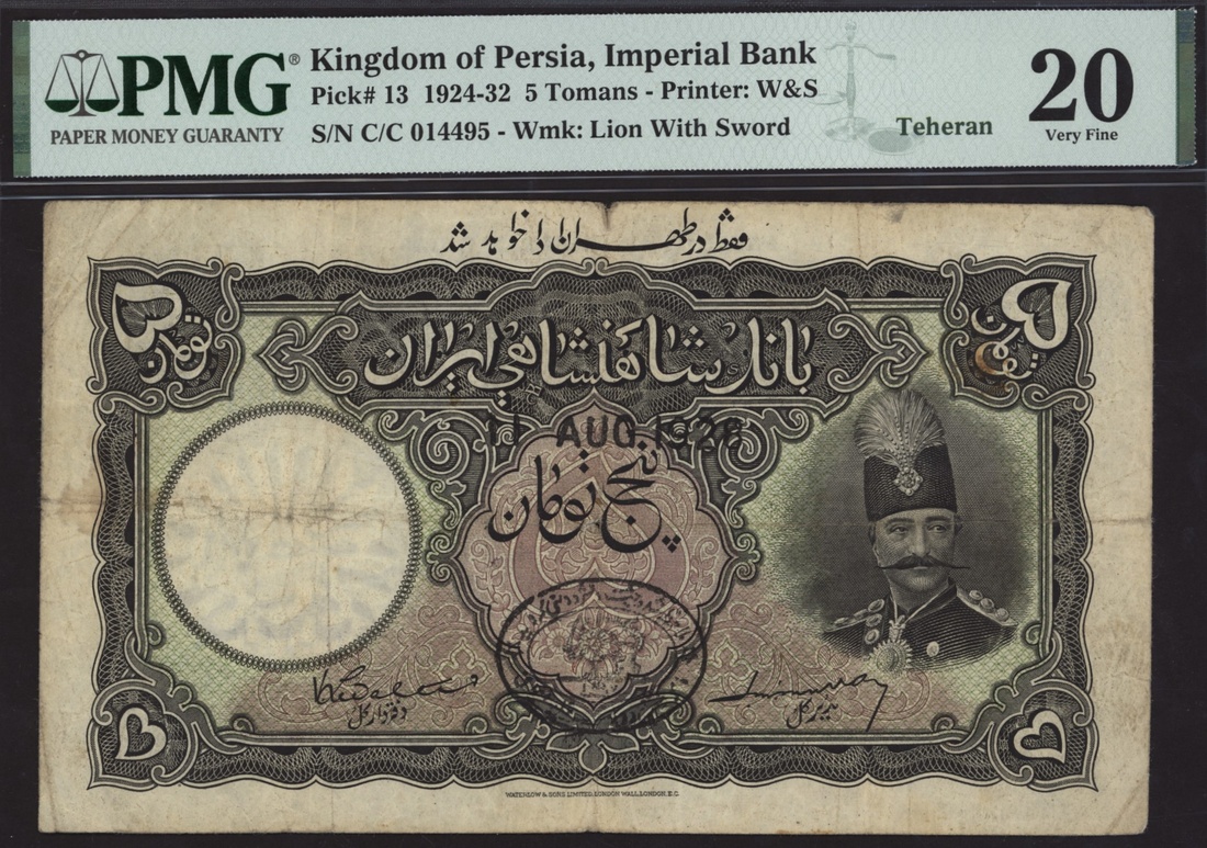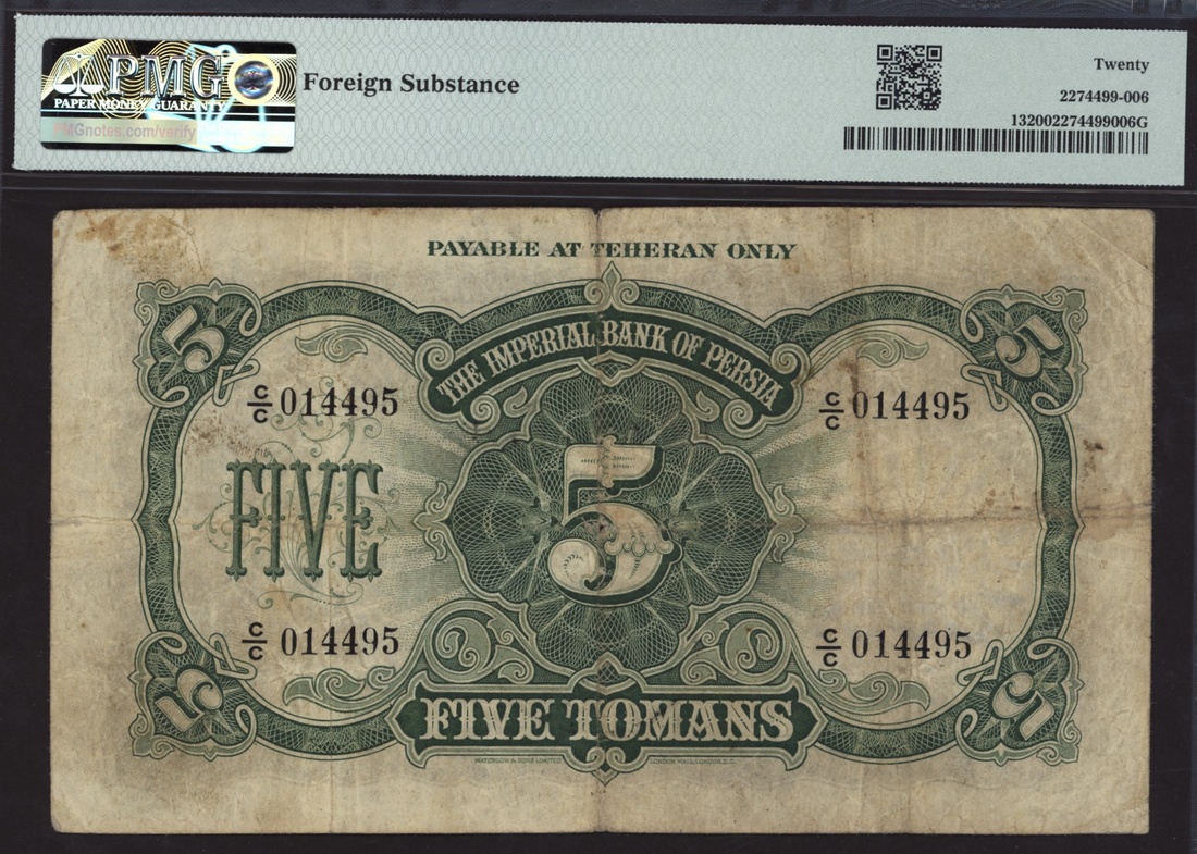 Imperial Bank of Persia, 5 Tomans, Teheran, 1924-1932, serial number C/C 014495, (Pick 13), in PMG holder 20 Very Fine, foreign substance
