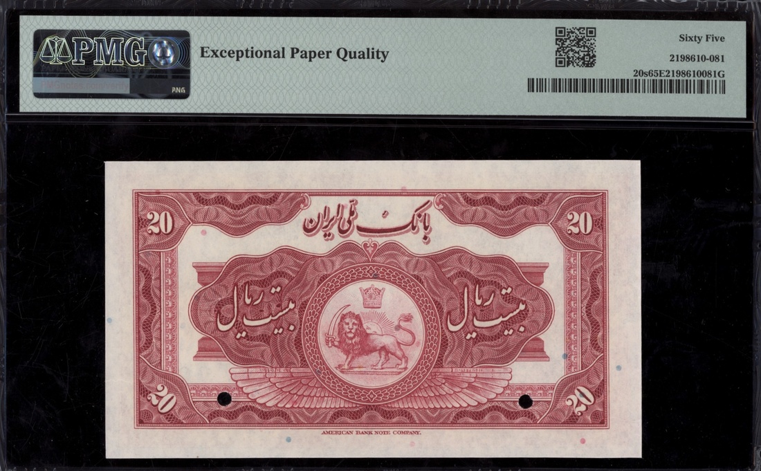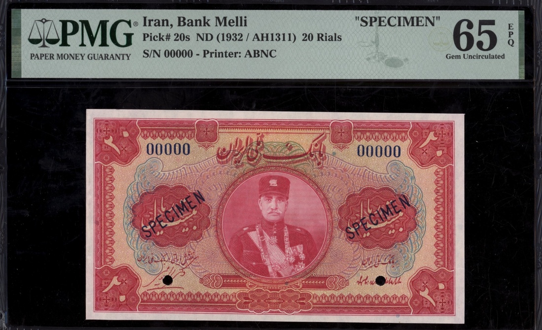 (x) Bank Melli, Iran, specimen 20 Rials, ND (1932), serial number 00000, (Pick 20s, BNB 103), in PMG holder 65 EPQ Gem Uncirculated