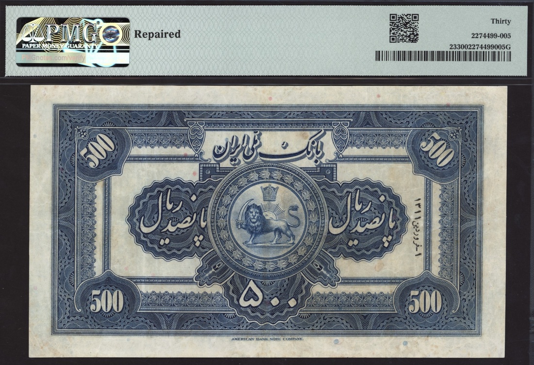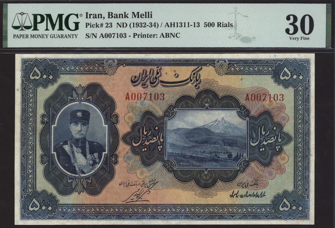 Bank Melli, Iran, 500 Rials, ND (1932-34), serial number A0007103, (Pick 23), in PMG holder 30 Very Fine