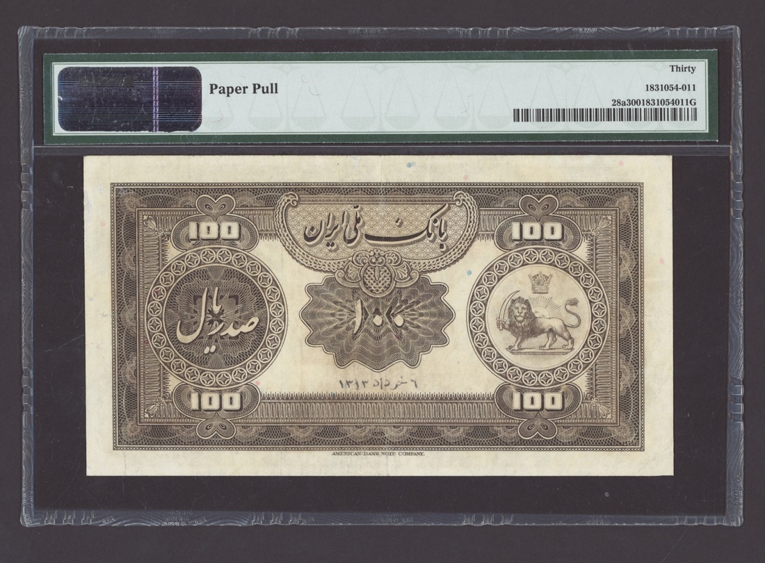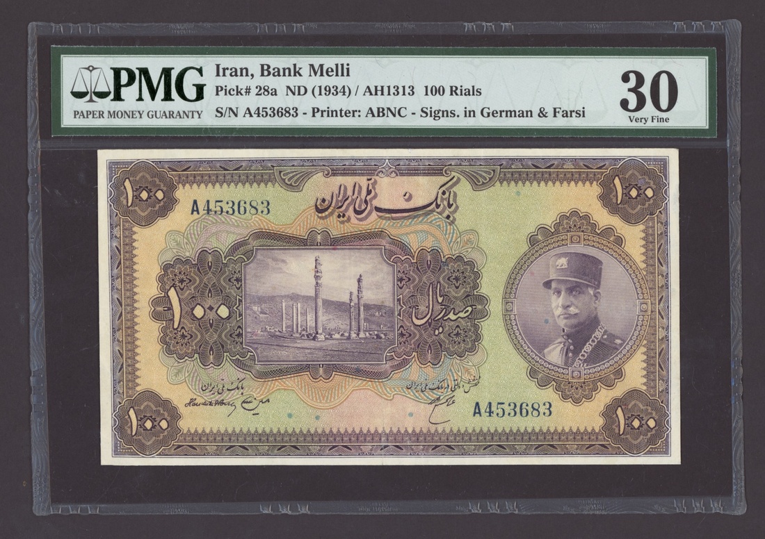 Bank Melli, Iran, 100 Rials, ND (1934), serial number A453683, (Pick 28a, BNB 111), in PMG holder 30 Very Fine, paper pull