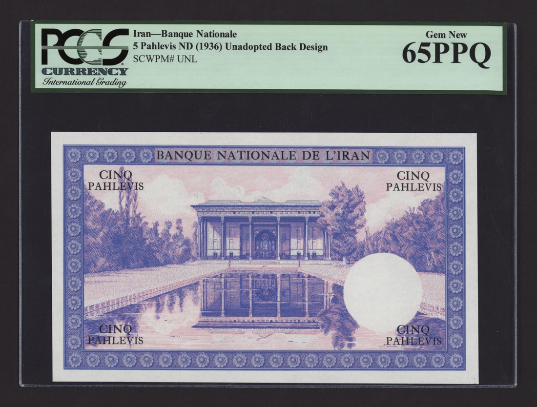 (x) Banque Nationale, Iran, [unadopted obverse and reverse design] 5 Pahlevis, 1936, (Pick Unlisted), in PCGS holders, 66PPQ, 65PPQ Gem New, rare (2 notes)