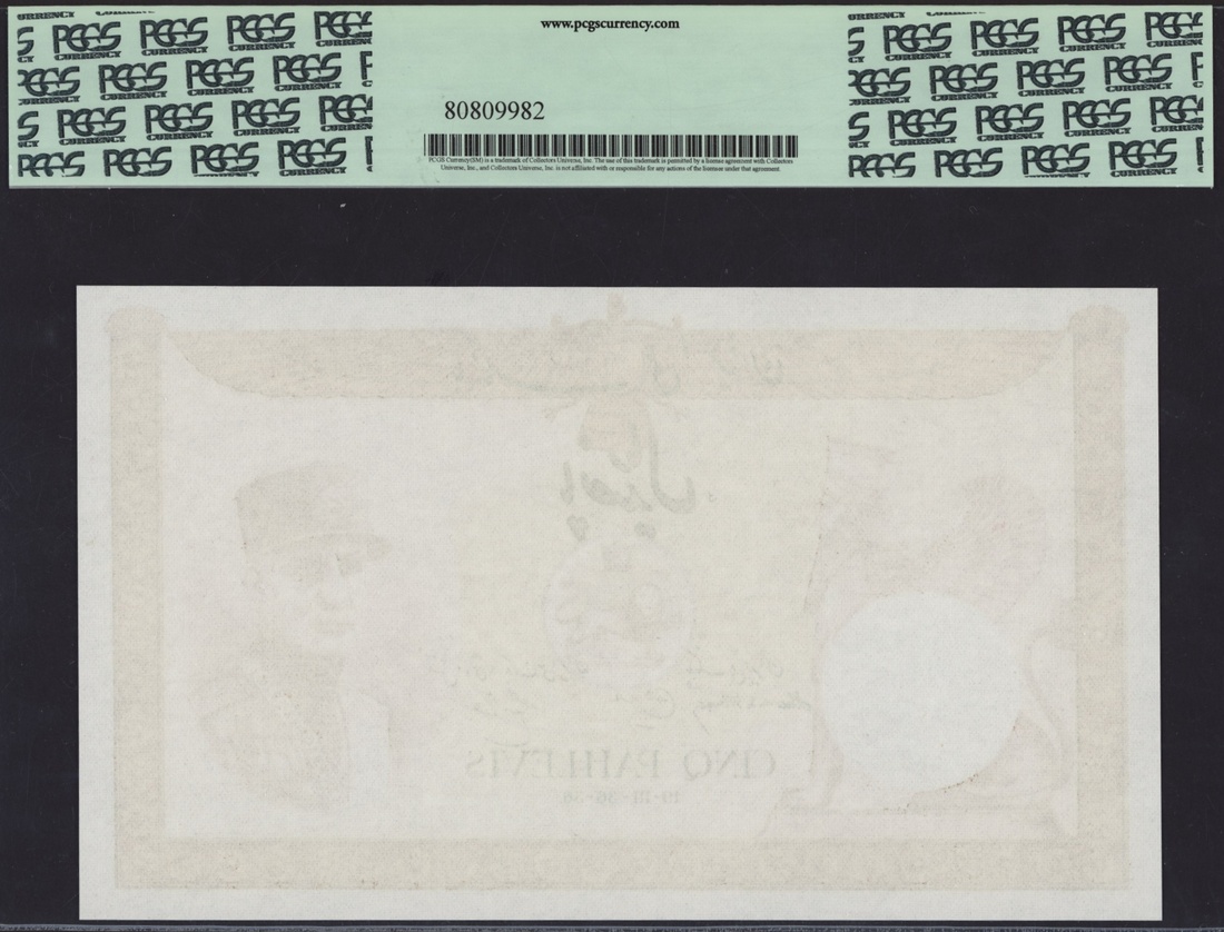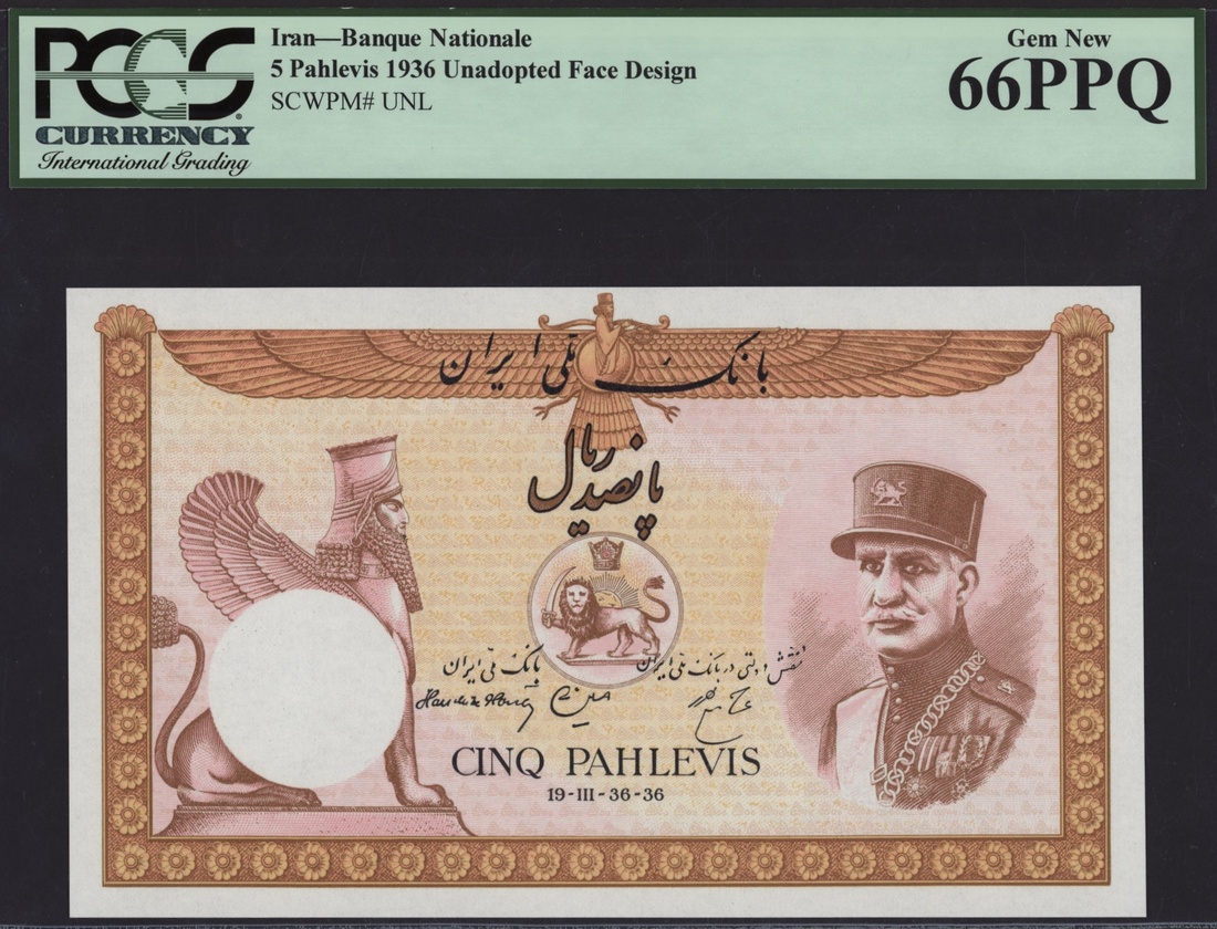 (x) Banque Nationale, Iran, [unadopted obverse and reverse design] 5 Pahlevis, 1936, (Pick Unlisted), in PCGS holders both 66 PPQ Gem New, rare (2 notes)