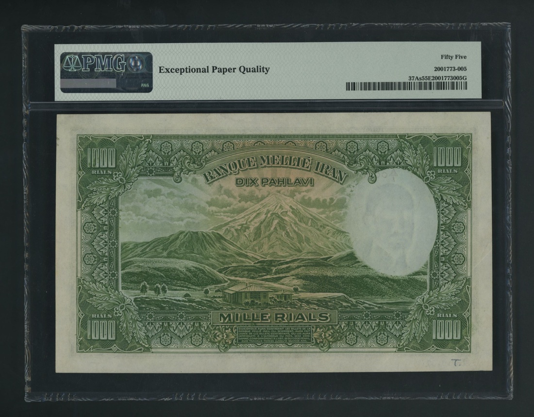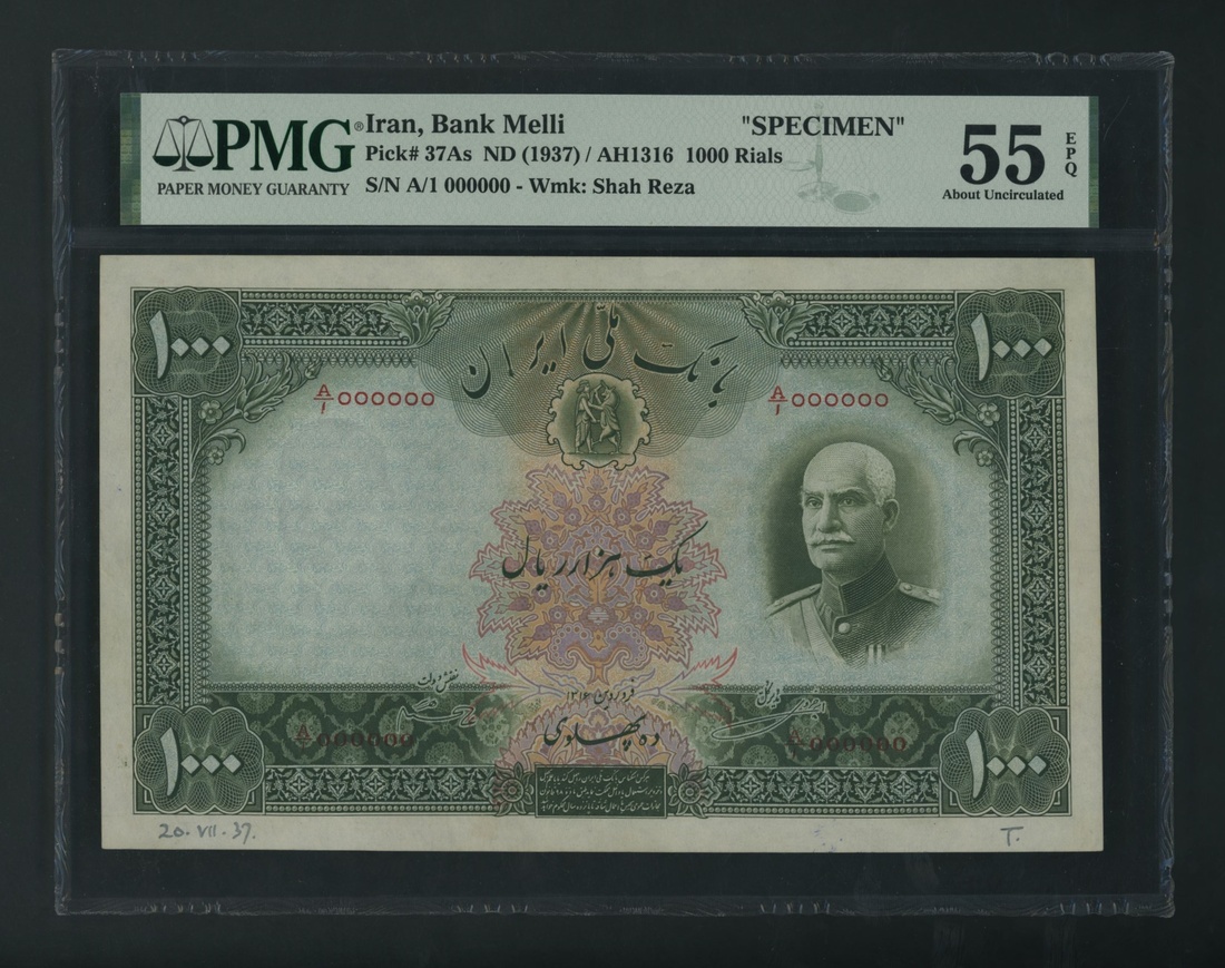 (x) Bank Melli, Iran, specimen 1000 Rials, ND (1937), red serial number A/1 000000, (Pick 37As, BNB 124as1), in PMG holder 55 EPQ About Uncirculated, only 3 graded, 2 notes in higher grade on PMG Census, rare