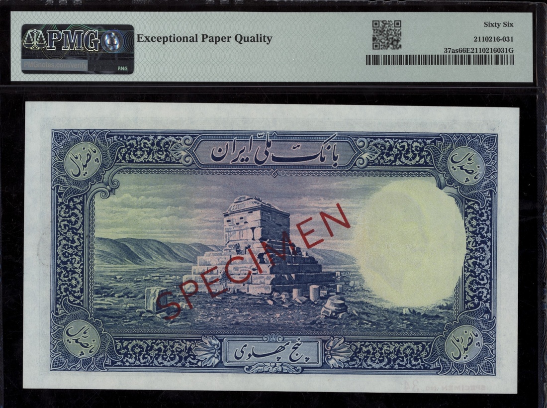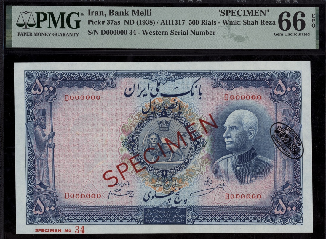 (x) Bank Melli, Iran, [Top Pop] specimen 500 Rials, ND (1938), serial number D000000 34, (Pick 37as, BNB 131), in PMG holder 66 EPQ Gem Uncirculated
