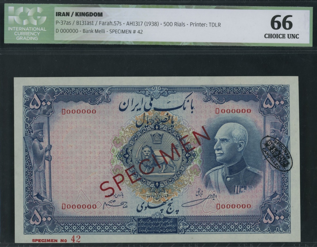 (x) Bank Melli, Iran, specimen 500 Rials, ND (1938), serial number D 000000 42, signatures Hjier / Amir Khosravi,