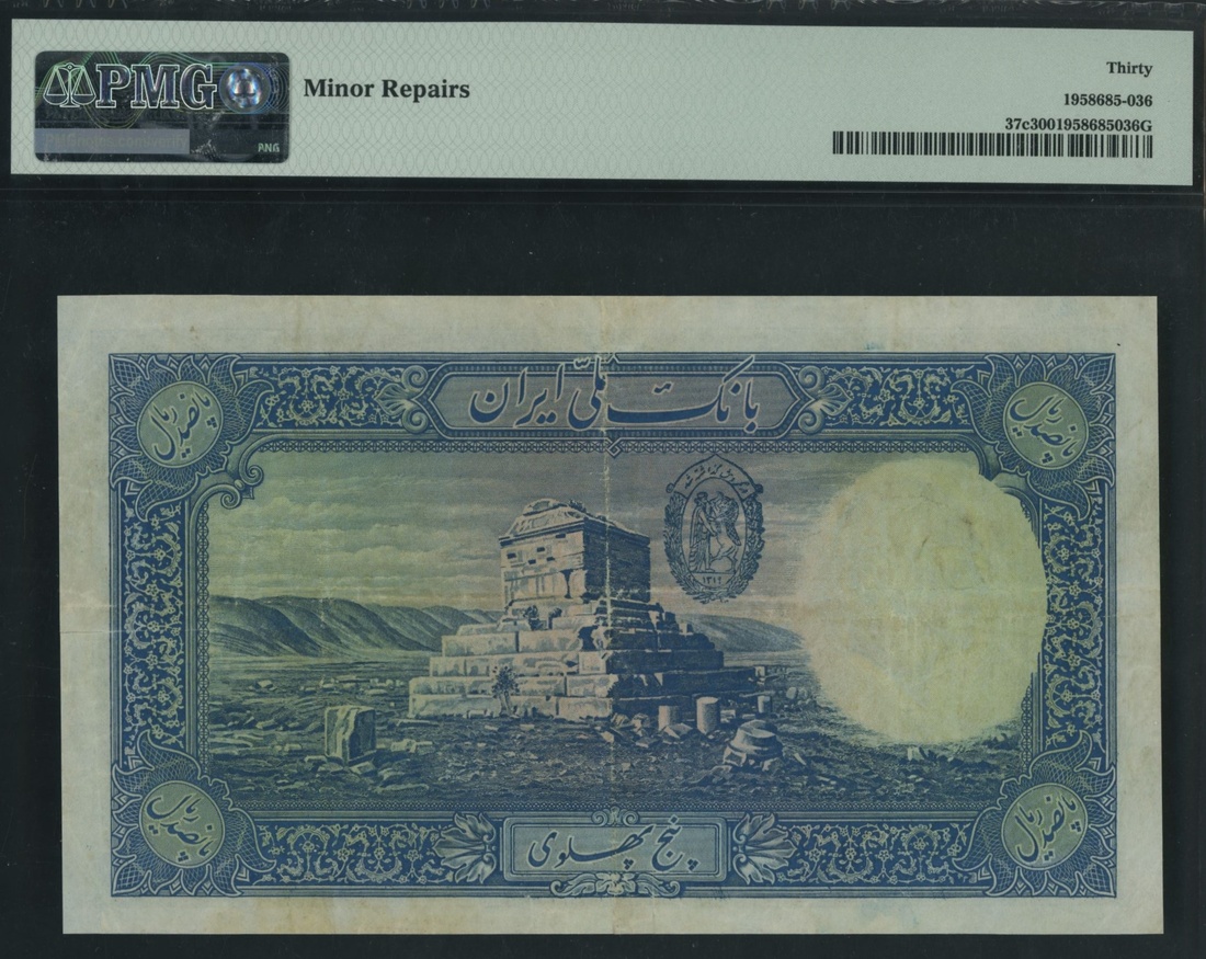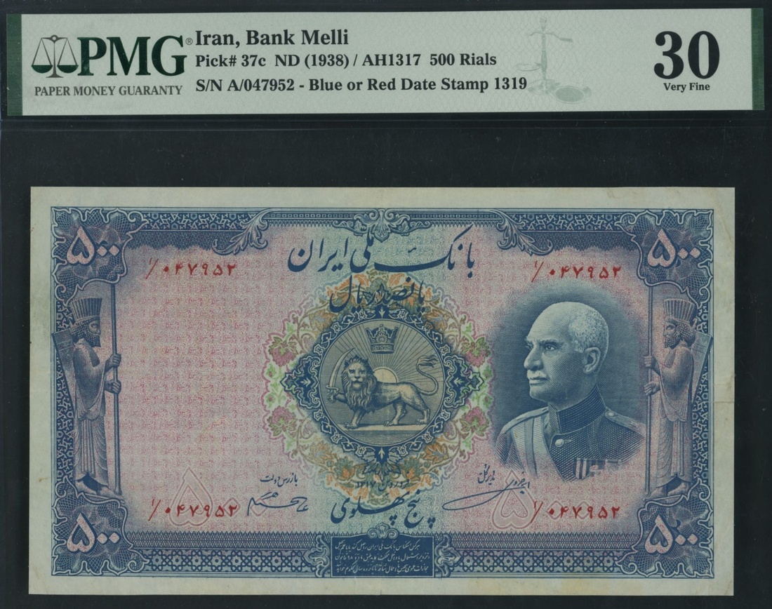 (x) Bank Melli, Iran, 500 Rials, ND (1938), serial number A/047952, (Pick 37c, BNB 131), in PMG holder 30 Very Fine, minor repairs, only 6 notes in higher grades at PMG