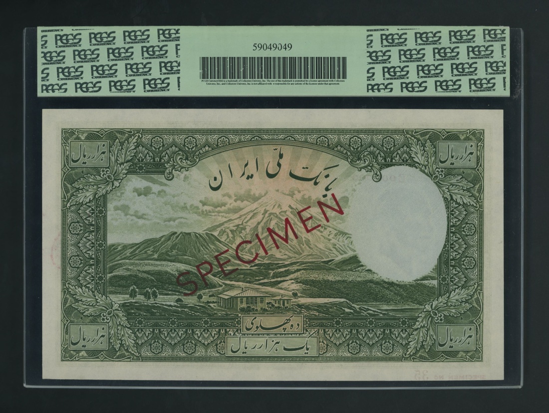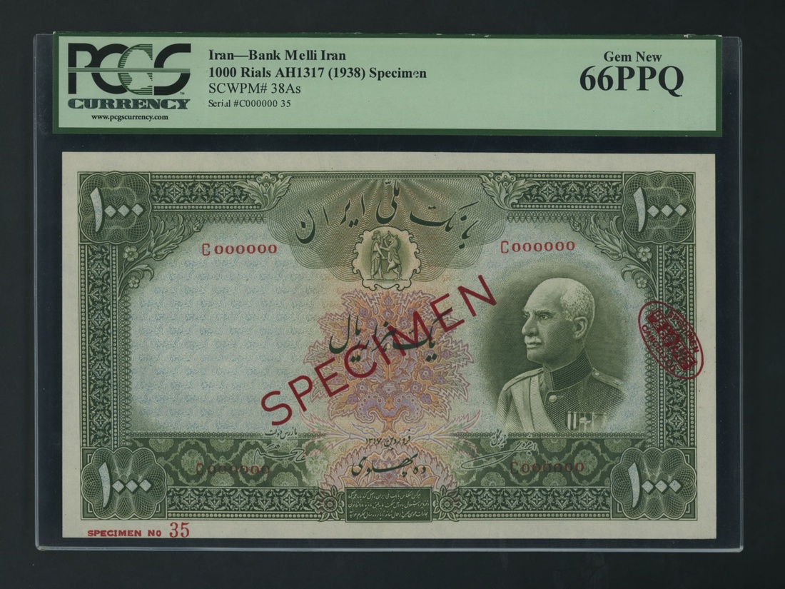 (x) Bank Melli, Iran, specimen 1000 Rials, ND (1938), serial number C000000 35, (Pick 38As, BNB 132s), in PCGS holder 66 PPQ Gem New, scarce especially in this grade