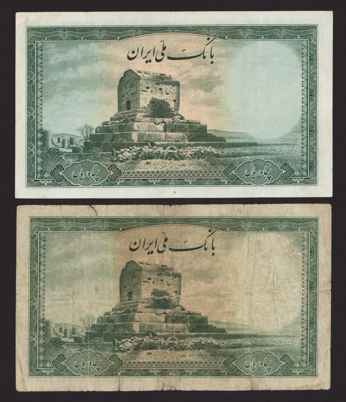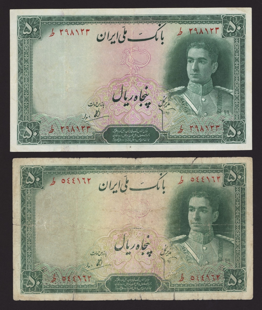 (x) Bank Melli, Iran, [2 notes] 50 Rials, ND (1944), serial numbers T298123 and T544162, (Pick 42, BNB 137), good fine and about fine (2 notes)