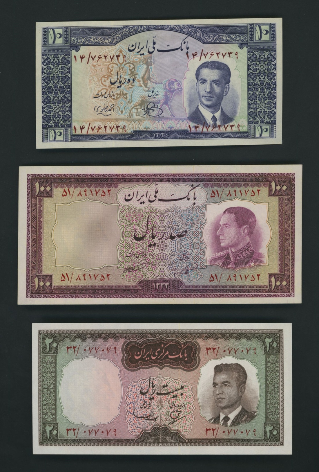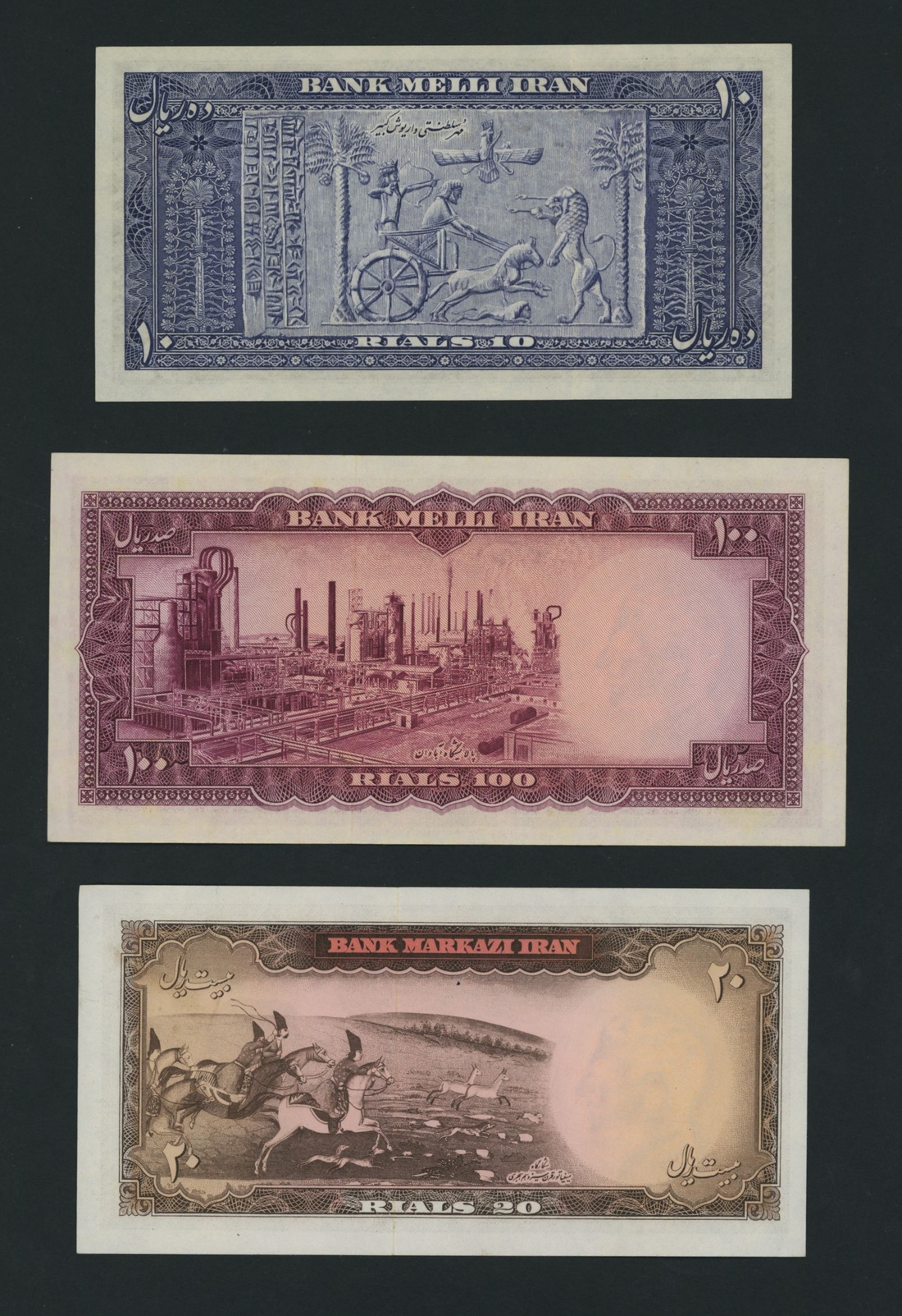 (x) Bank Melli, Bank Markazi, Iran, [3 notes] 10, 20, 100 Rials, 1951-65, 10 Rials, SH1330/1951, serial number 14/762739; 100 Rials, SH1333/1954, serial number 51/891752; 20 Rials, ND (1965), serial number 32/077079