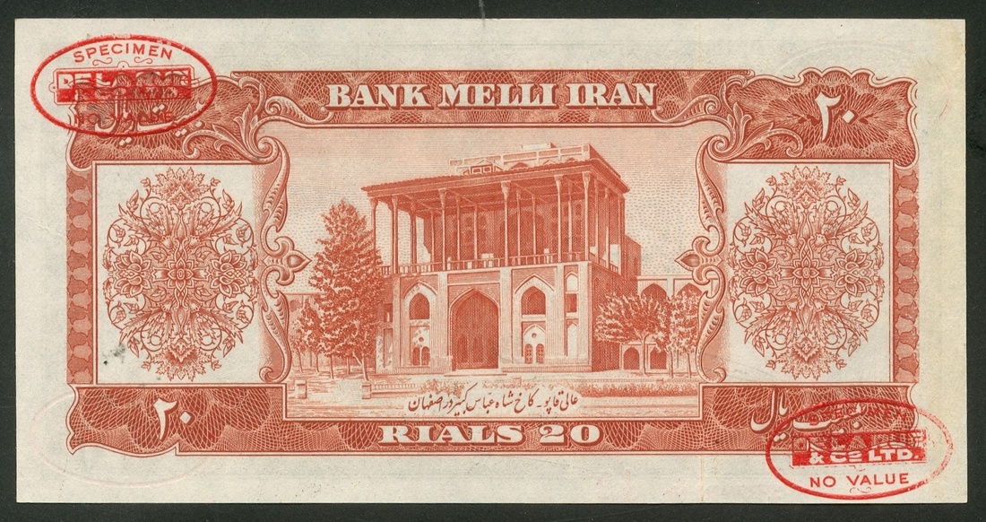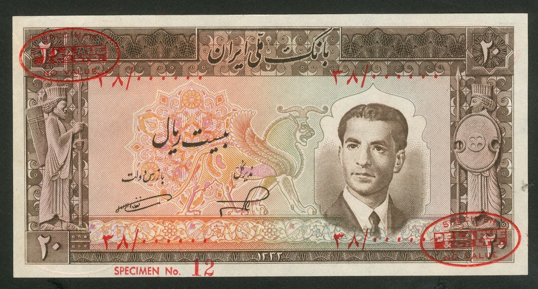 (x) Bank Melli, Iran, specimen 20 Rials, 1332 (1953), specimen number 12, (Pick 60s, BNB 150bs1), uncirculated