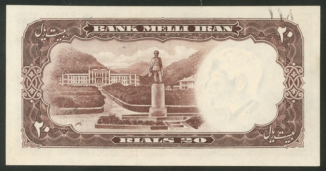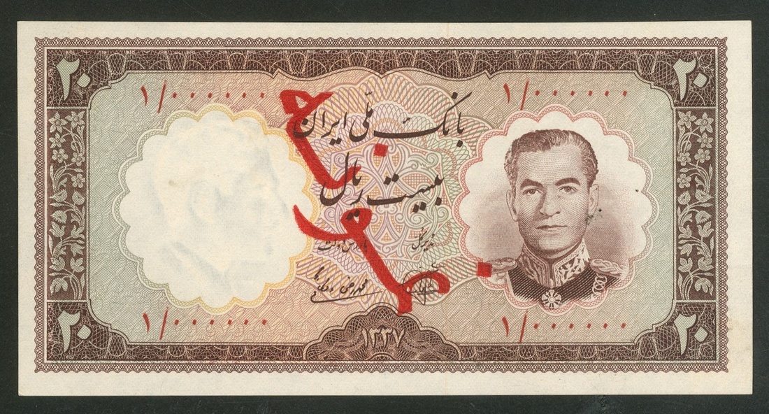 (x) Bank Melli, Iran, specimen 50 Rials, 1337 (1958), specimen number 118 on reverse