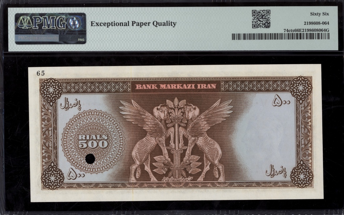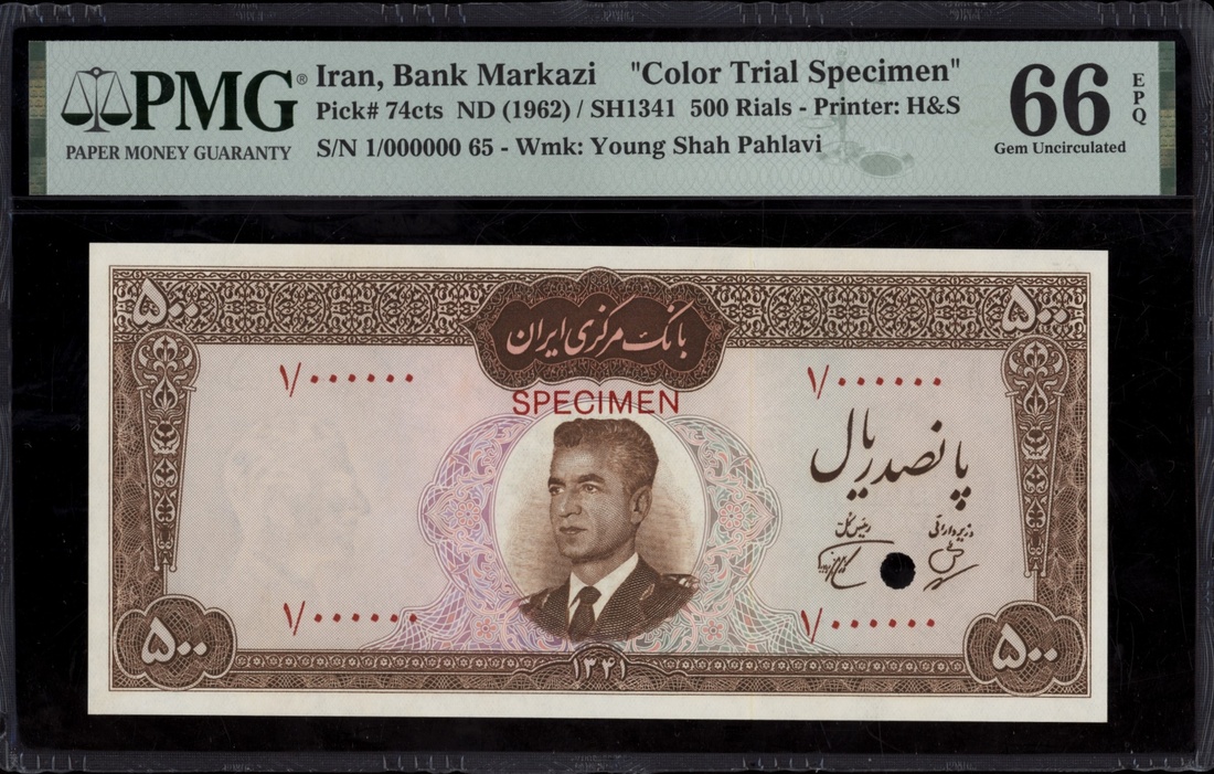 (x) Bank Markazi, Iran, colour trial specimen 500 Rials, ND (1962), serial number 1/000000 65, (Pick 74cts, BNB 206), in PMG holder 66 EPQ Gem Uncirculated